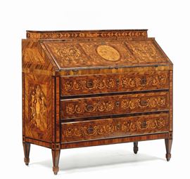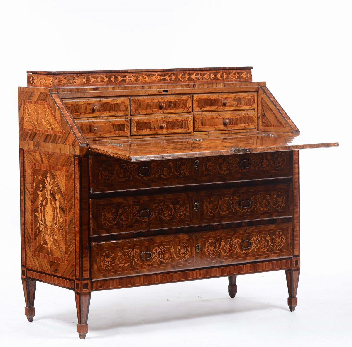 fronte e fianchi dritti, tre cassetti sotto la calatoia celante sei cassettini, decori intarsiati a motivo di racemi vegetali, cm 125x58x121 (difetti)