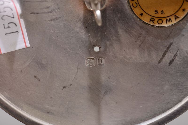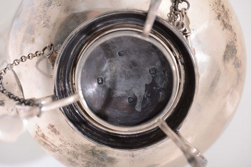 Samovar con corpo globulare liscio con incise riserve circolari decorate a volute. Fornello a tripode sagomato, altezza cm 32 peso gr 1460