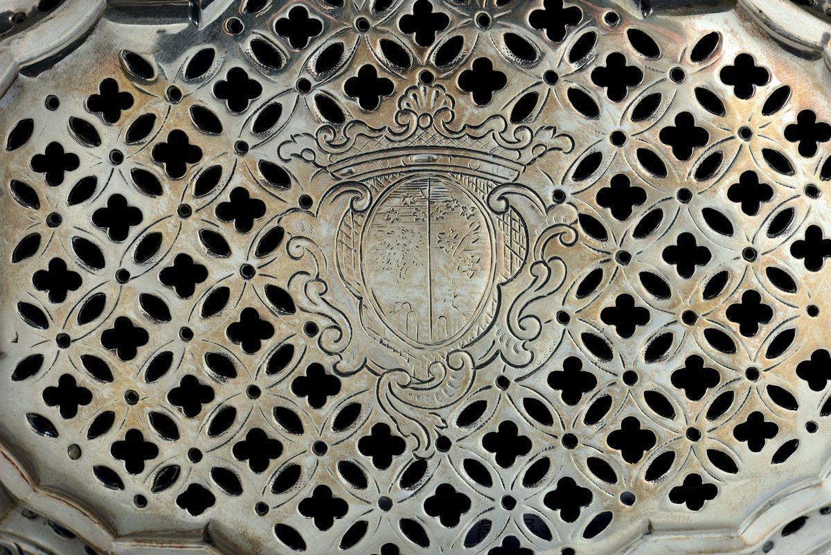 Lo scaldino, dalla forma poligonale e dalle misure contenute, è finemente cesellato con motivi a volute e riserve derivati dai modelli ornamentali introdotti in Francia dall’architetto Jean Bérain (1637-1711) che ebbero lago successo in tutta Europa. Particolarmente attenta nella ricezione di nuovi modelli stilistici provenienti d’oltralpe è a Milano la storica bottega del carciofo, già documentata dal 1587, come testimonia la comparazione con il piatto ovale, in collezione privata milanese che presenta un medesimo modulo decorativo che comprende anche il piccolo paesaggio con architetture al centro di una riserva sagomata. Cfr.:“Gli argenti milanesi”, G.Sambonet, ed. Longanesi, Milano 1987, p. 96