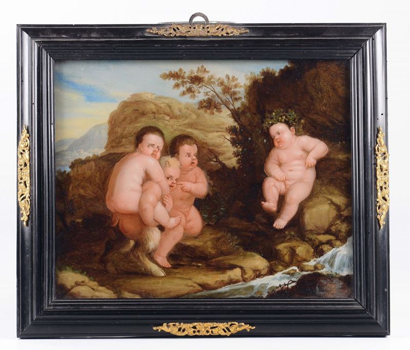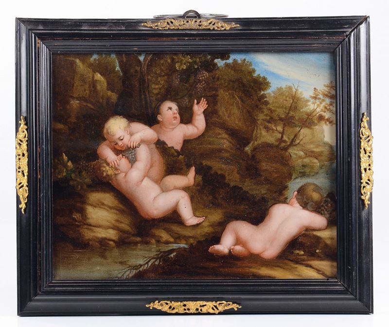 coppia di dipinti ad olio su vetro, cm 27x33, in cornici ebanizzate e bronzi dorati