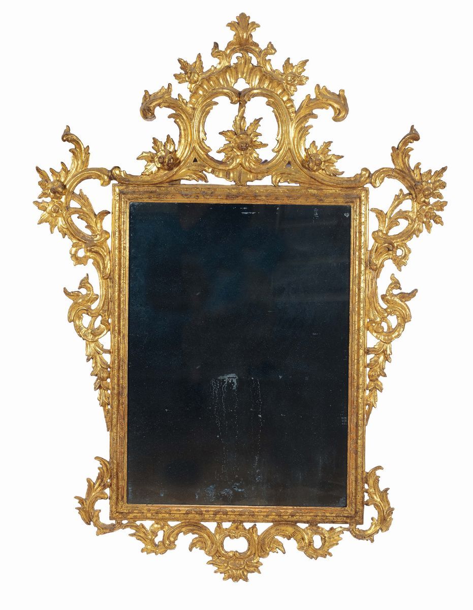 Specchiera Luigi XV in legno intagliato ed interamente dorato, Lucca XVIII secolo