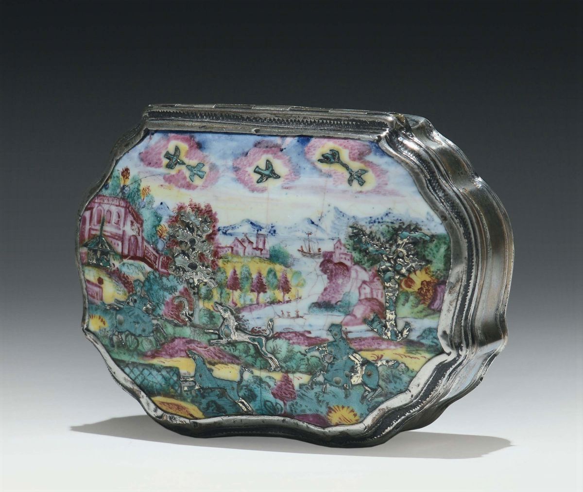 fondello inciso con motivi geometrici e architettonici e floreali, sul coperchio leggermente bombato raffigurazione di paesaggio con architetture in smalti policromi ed inserti animali e vegetali in argento, cm 8x5,5