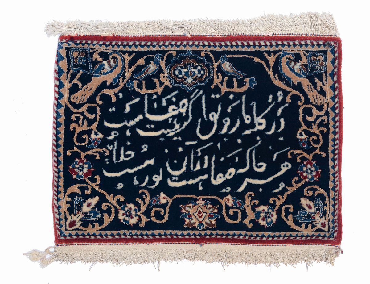 campo blu con iscrizione, parti in seta, cm 58x40