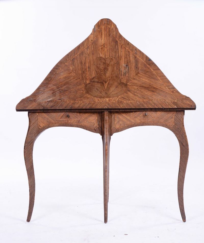 Tavolino da gioco Luigi XV triangolare apribile lastronato in violetto e filettato in bois de rose, Genova, metà XVIII secolo