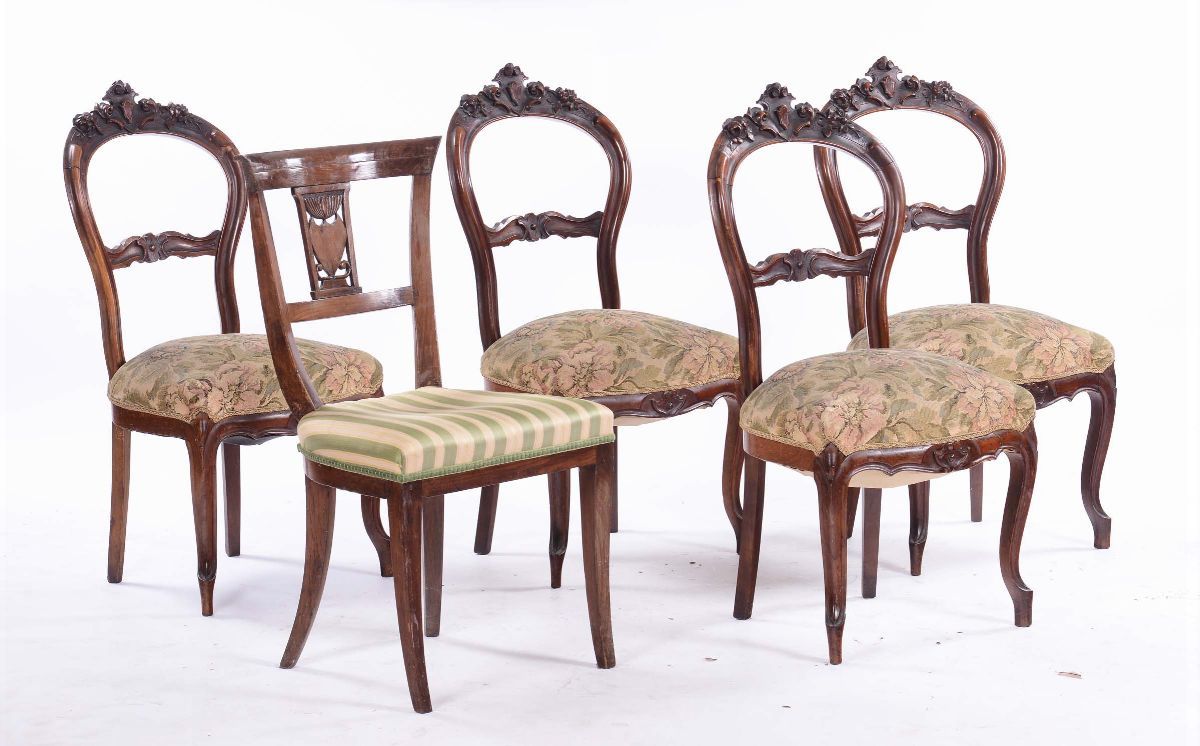 Tavolo da pranzo e cinque sedie diverse, XIX secolo