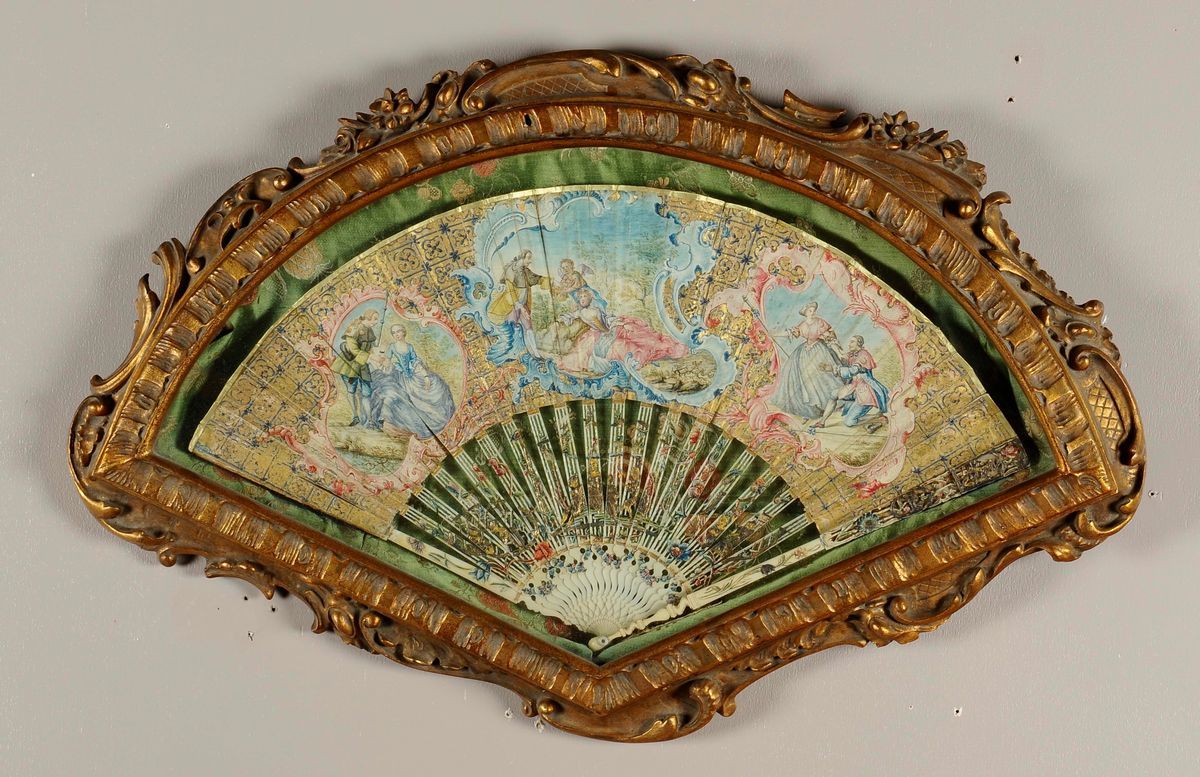 Ventaglio dipinto con stecche in avorio entro cornice dorata, XIX secolo