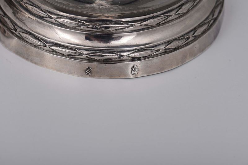 Coppia di candelieri in argento sbalzato, Stati Sabaudi, punzoni in uso dal 1783 al 1803, punzoni dell’argentiere non identificato