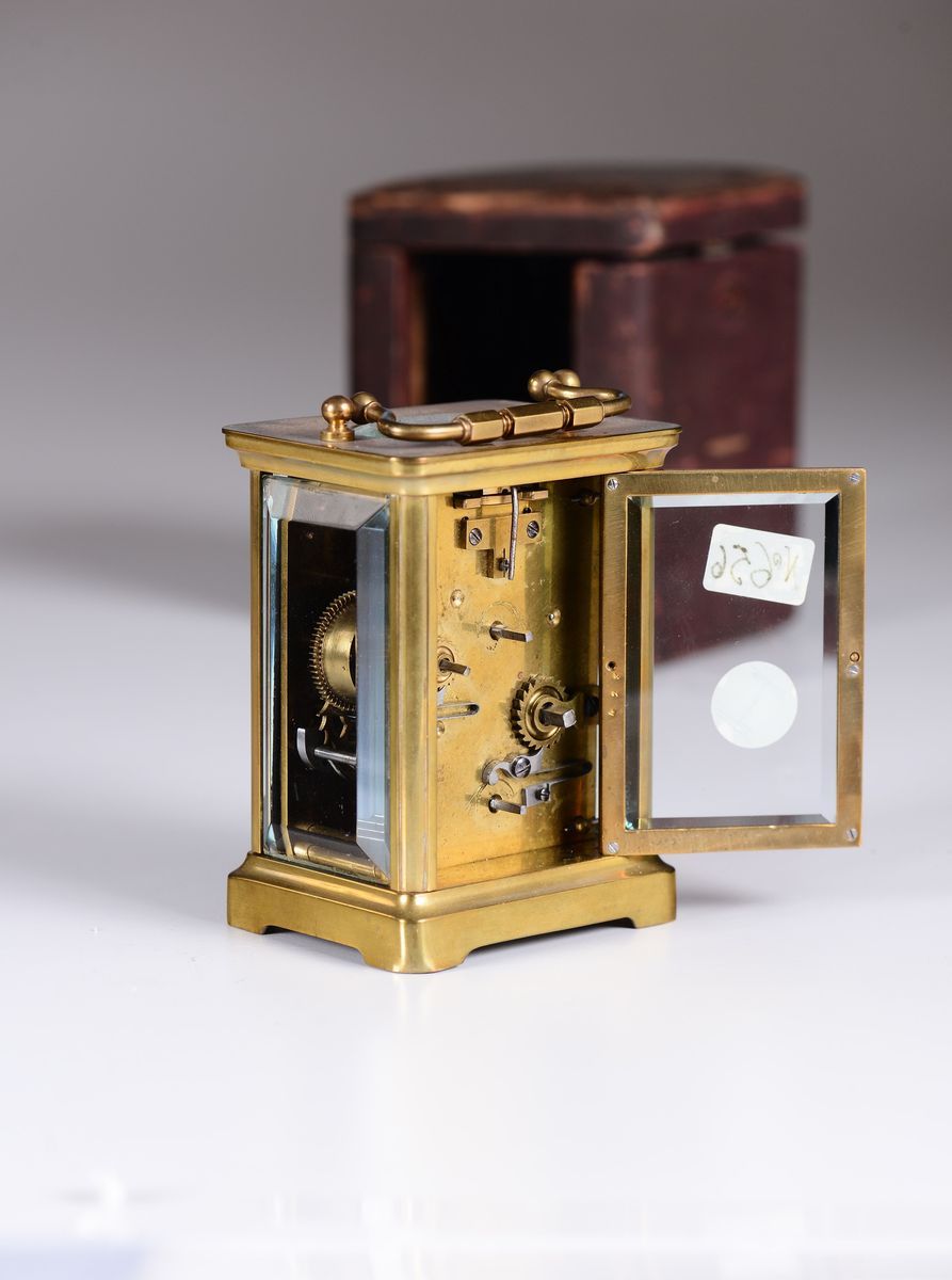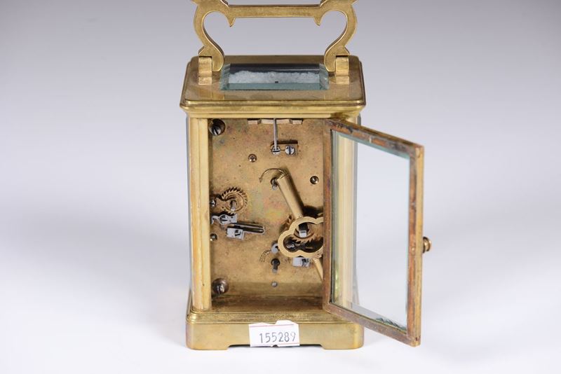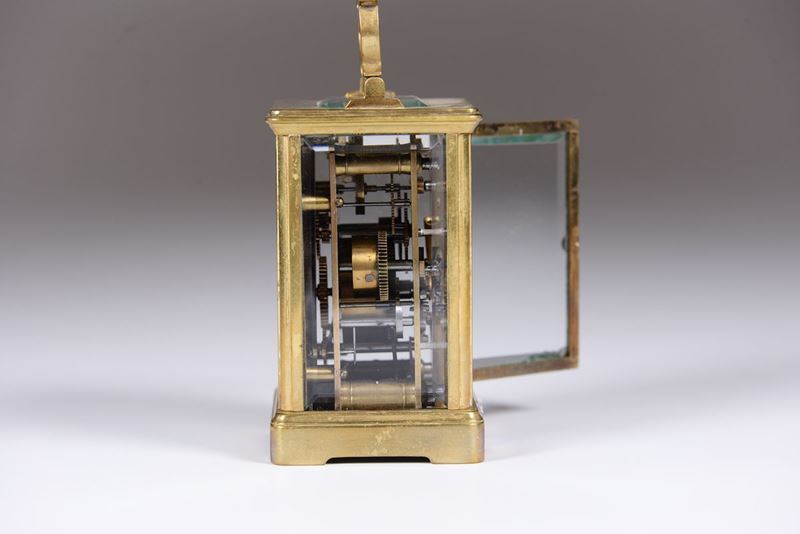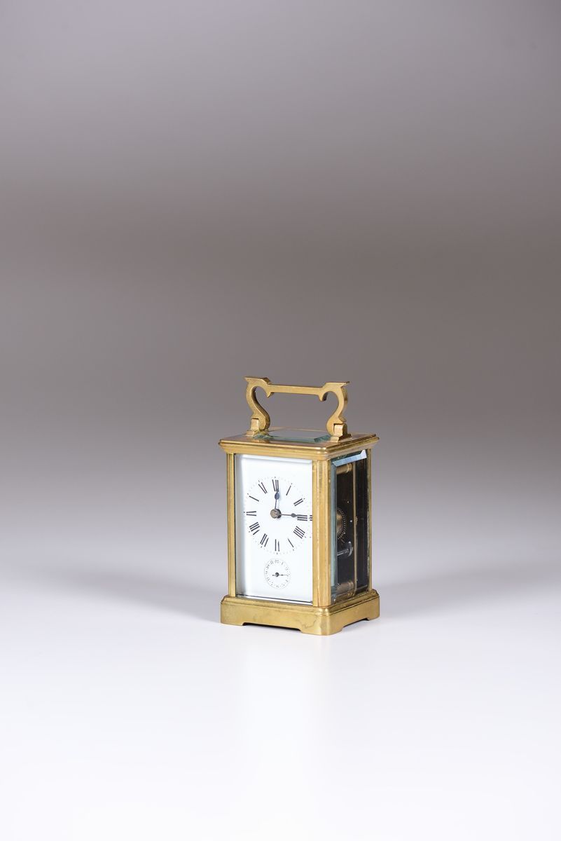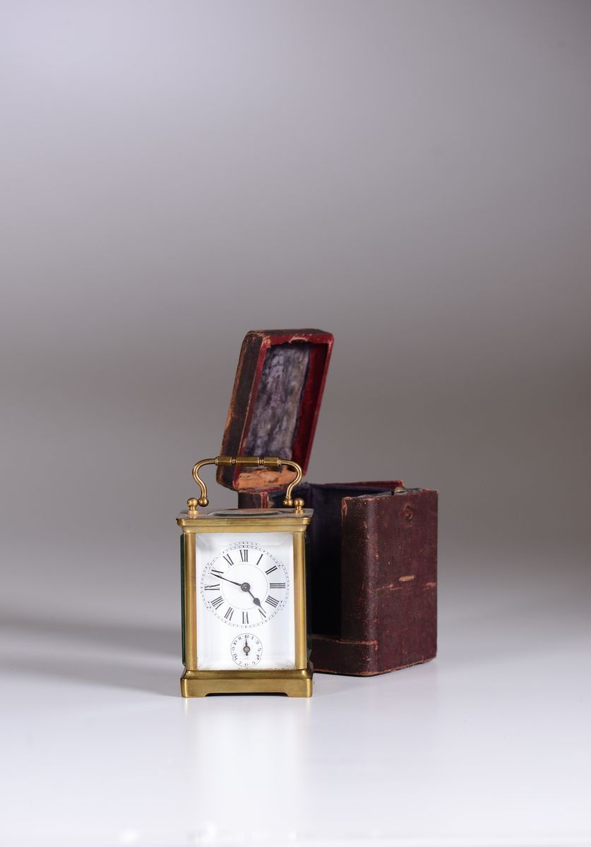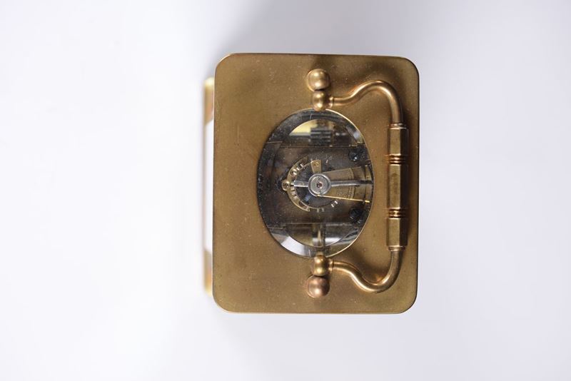 Quadranti bianchi con numerazione romana in nero per le ore e quadrantino per la sveglia; una in custodia, cm 8x6x10 e cm 8x6,5x12