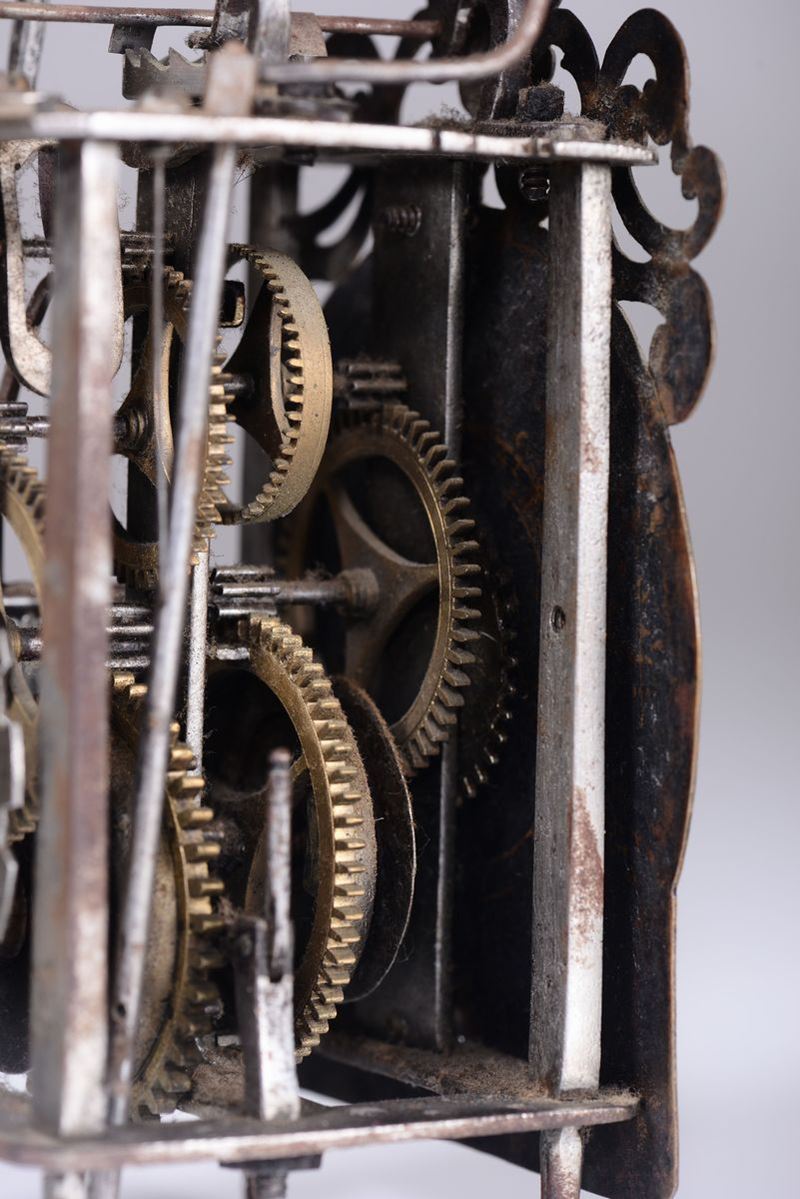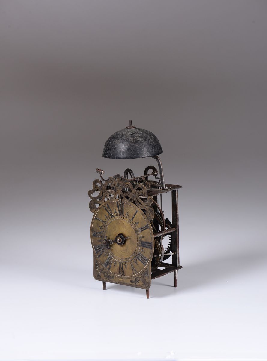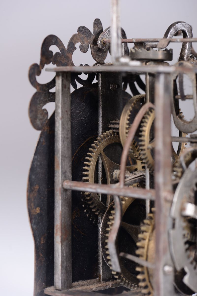 Quadrante in metallo dorato con numerazione romana in nero per le ore. scappamento a verga con suoneria delle ore su campana.cm 12x9x25