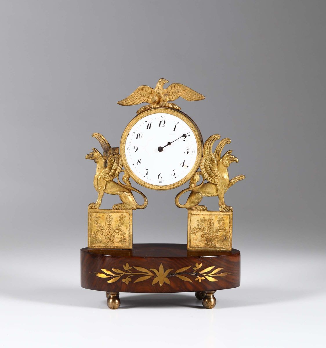 Quadrante in smalto bianco con numerazione romana in nero per le ore e araba per i minuti, base in marmo nero. Meccanica solo tempo con scappamento ad ancora e sospensione a lamellacm 16x8x29