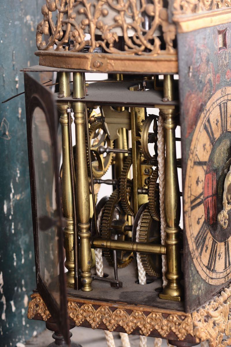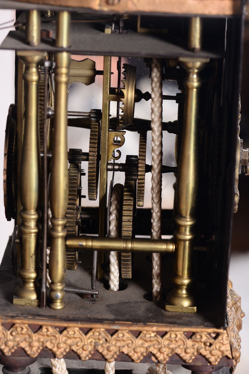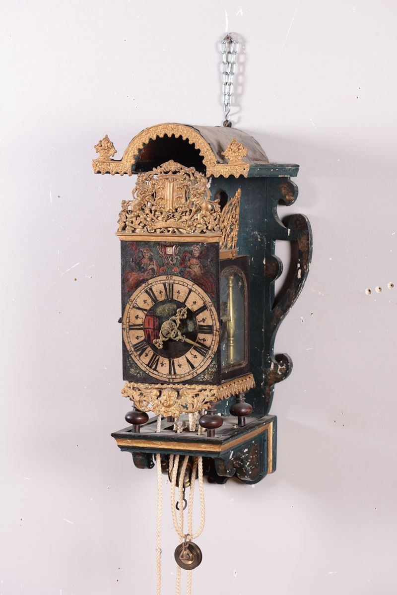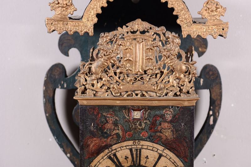 Cassa in metallo dipinto in policromia con figure sopra il quadrante a numerazione romana per le ore e araba per i minuti. Mensola in legno. Scappamento a verga, suoneria a ore e mezze su campanacm 33x23x62