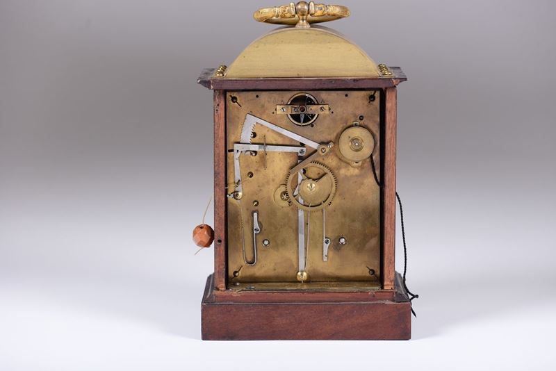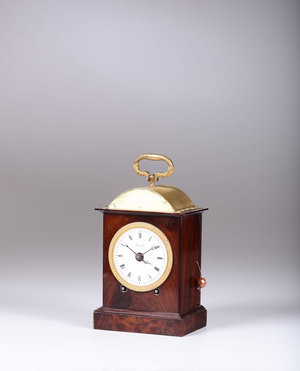 Quadrante circolare in smalto bianco firmato Robert con numerazione romana in nero per le ore. Meccanica rettangolare con bilanciere e scappamento a cilindro, suoneria a ore e mezze al passaggio e richiesta, svegliarono con carica tramite cordicella.cm 14,5x10x23
