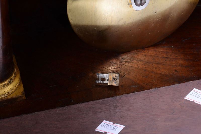 cassa in legno di noce, colonne con capitelli in bronzo dorato. Quadrante con numerazione romana in nero per le ore con firma Debay a Paris. Scappamento ad ancora con pendolo da regolatore, suoneria a ore e mezze.cm 28x15x50