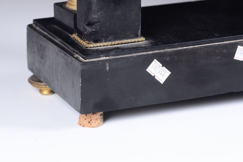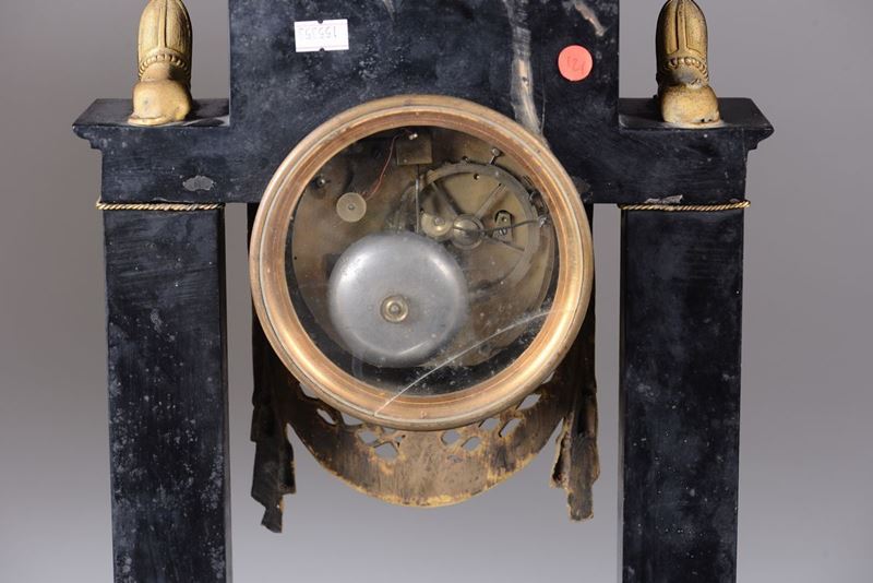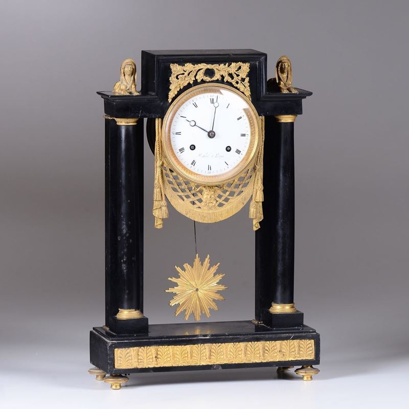 Cassa in marmo nero con decorazioni in bronzo dorato. Due colonne sorreggono un’architrave sormontato lateralmente da due sfingi a tutto tondo, sotto il quale è inserito il quadrante, in smalto bianco con numeri romani, sottolineato da un drappeggio. Grande movimento rotondo in ottone, scappamento ad ancora. Firmato sul quadrante P. Noel a Longres.cm 26x30x13