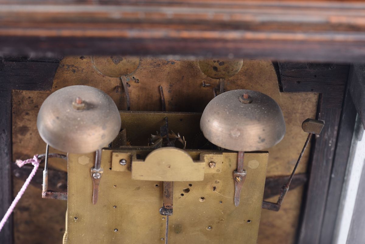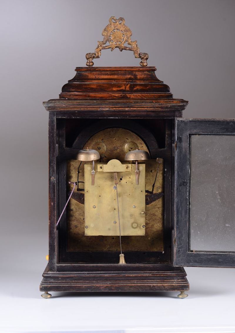 Cassa in noce con guarnizioni dorate e maniglia (non pertinente) in bronzo, quadrante in smalto bianco con ore romane nere su mostra cesellata e dorata; sulla lunetta, due quadrantini per il blocco della suoneria. Movimento rettangolare in ottone, scappamento a verga, suoneria a passaggio ore e quarti.cm 26x13x50