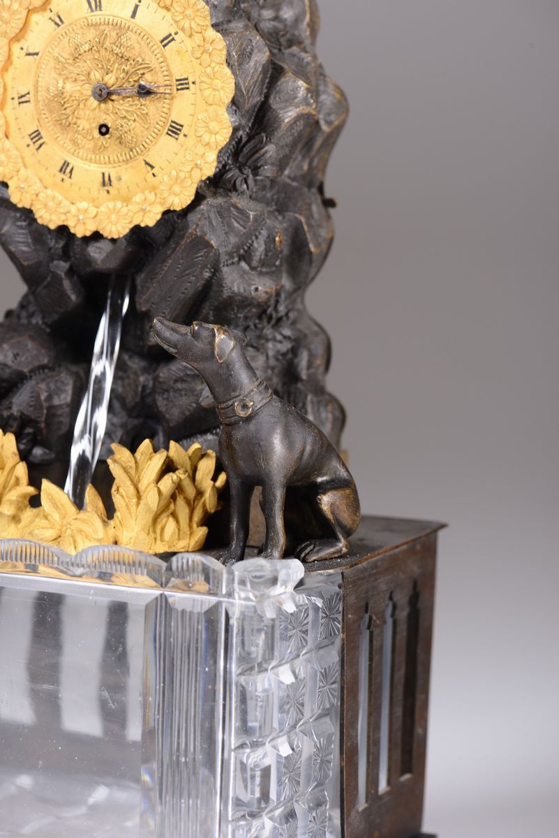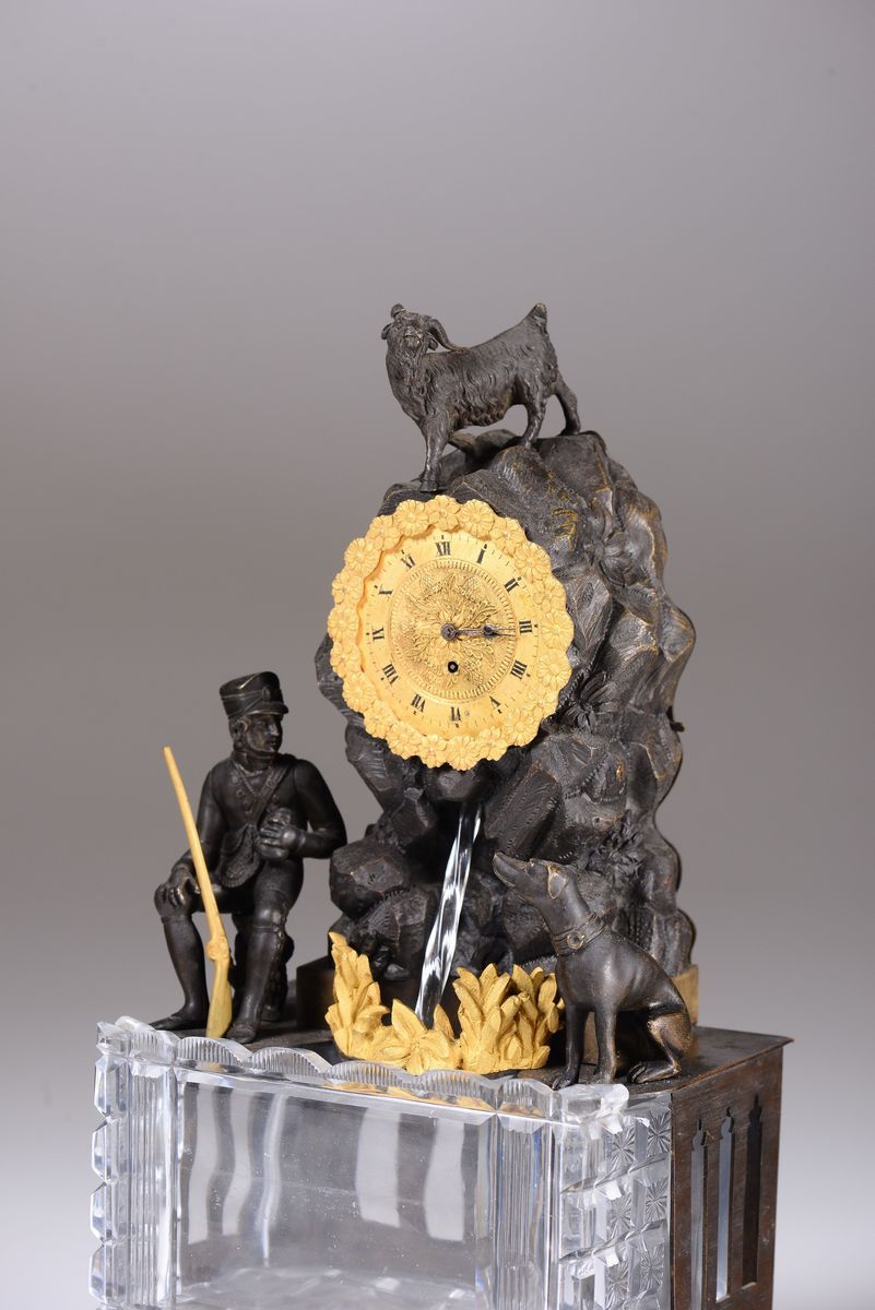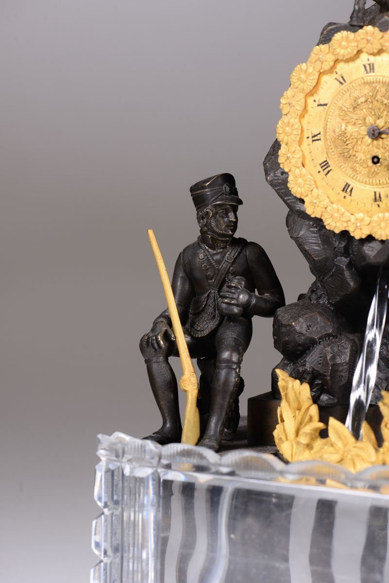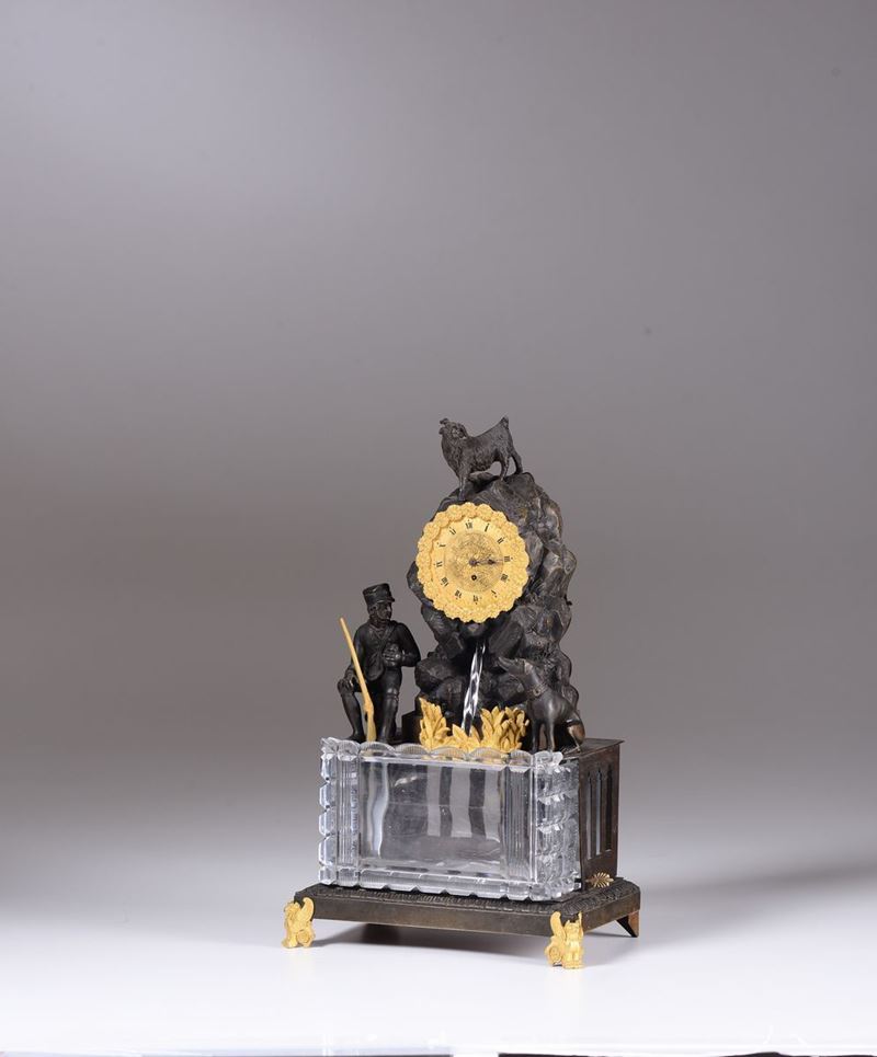 con raffigurazione di cacciatore con cane da cui si innalza la cassa rocciosa con capra sulla sommità. Alla base fontana in cristallo con automa, poggiante su piedini a grifone.Quadrante in bronzo dorato con numerazione romana in nero per le ore. Meccanica da tasca con scappamento a verga con carica a conoide solo tempo. Meccanismo per il funzionamento del getto dell’acqua.cm 21x14x35