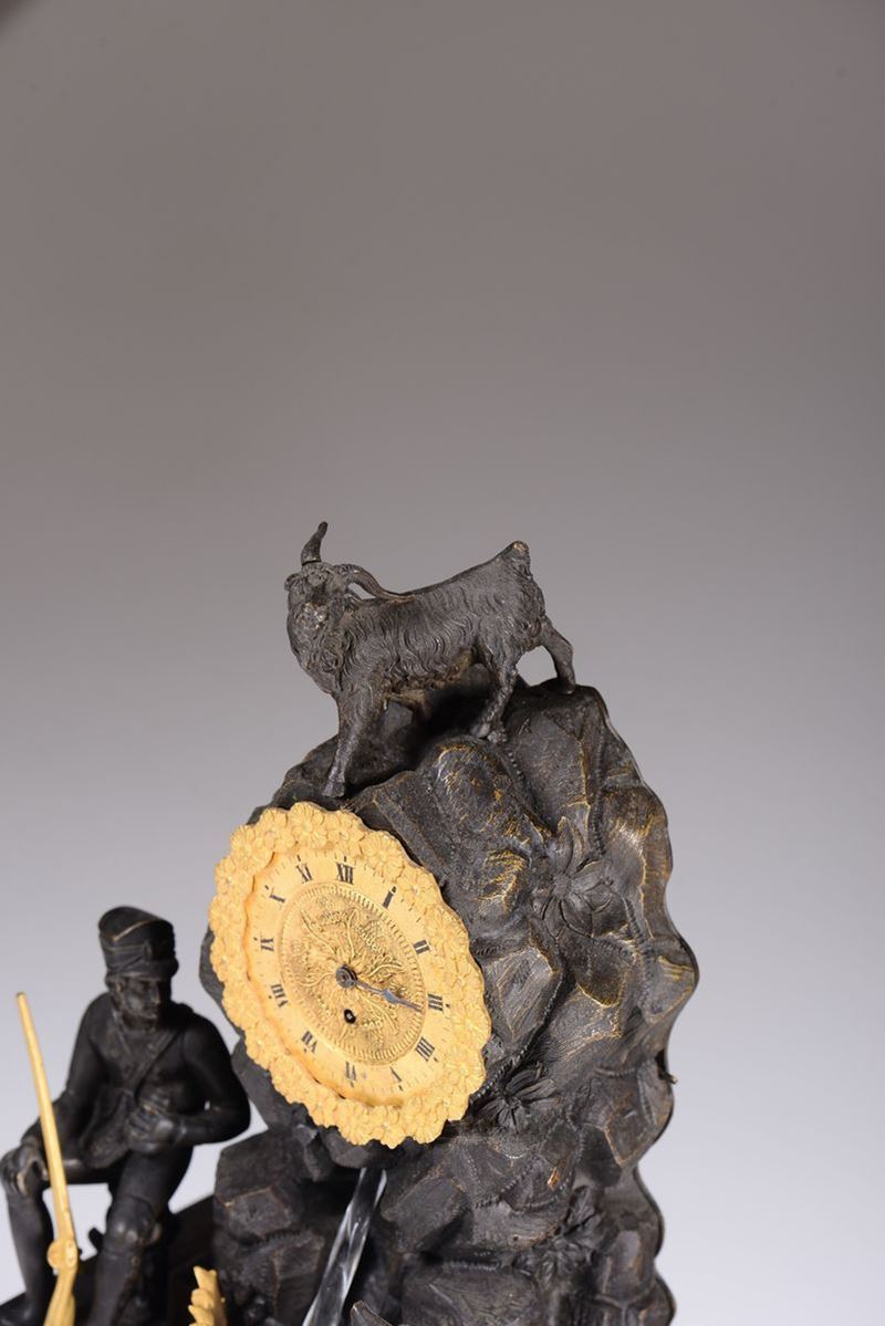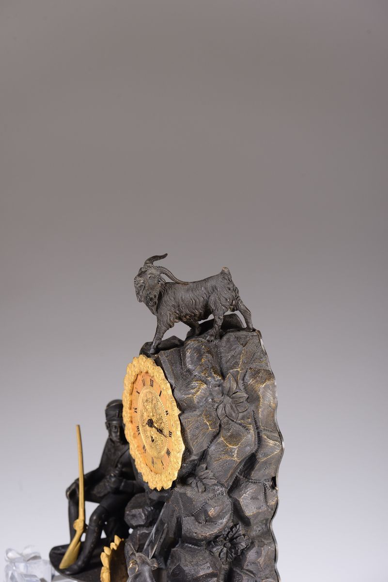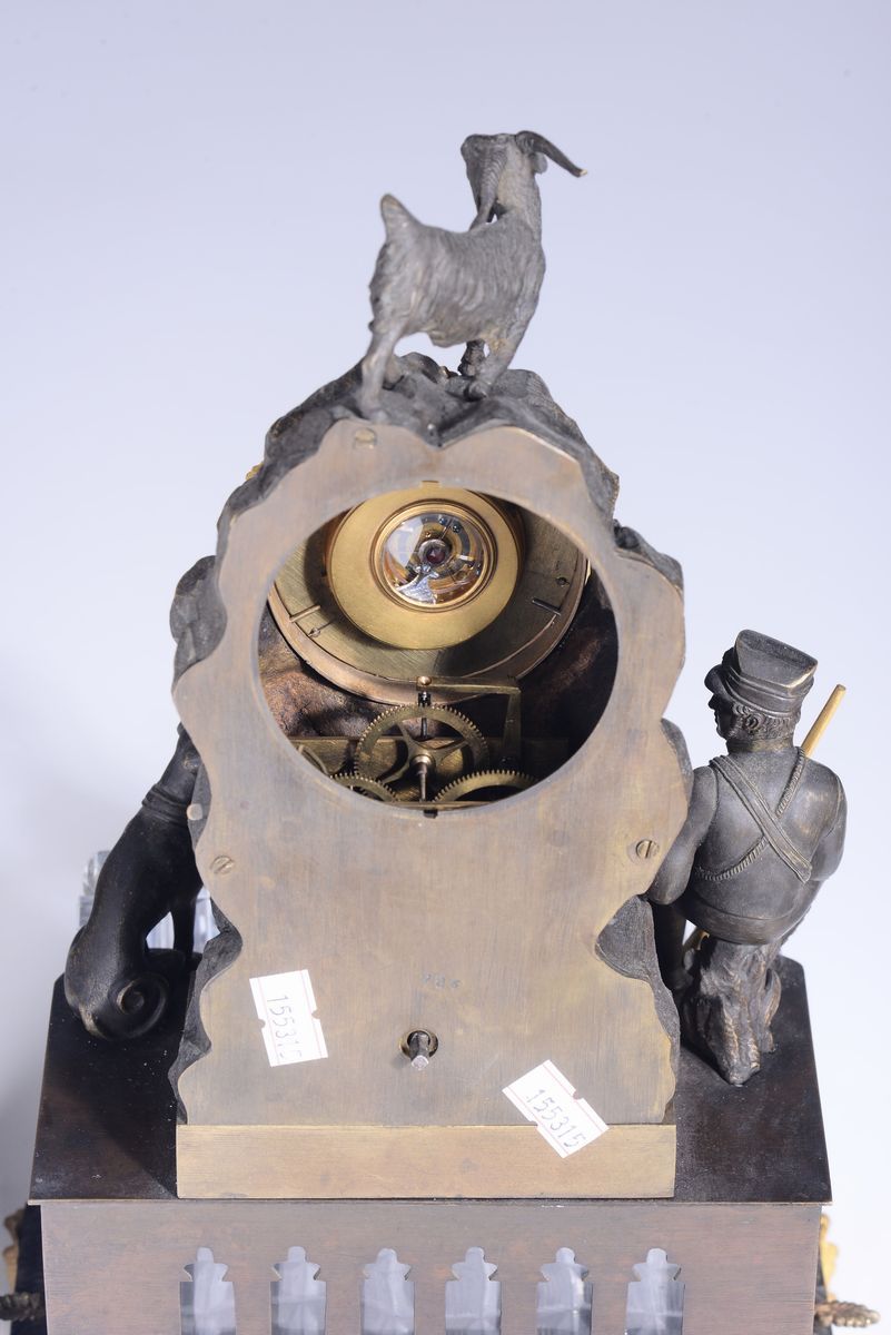 con raffigurazione di cacciatore con cane da cui si innalza la cassa rocciosa con capra sulla sommità. Alla base fontana in cristallo con automa, poggiante su piedini a grifone.Quadrante in bronzo dorato con numerazione romana in nero per le ore. Meccanica da tasca con scappamento a verga con carica a conoide solo tempo. Meccanismo per il funzionamento del getto dell’acqua.cm 21x14x35