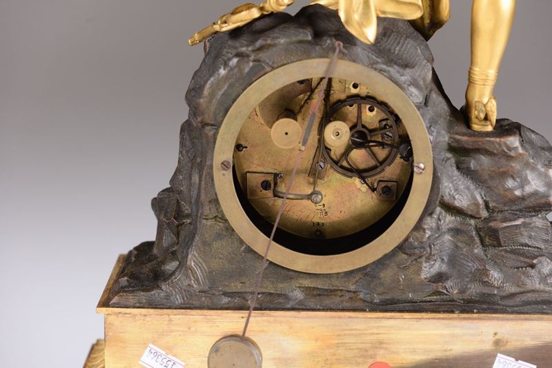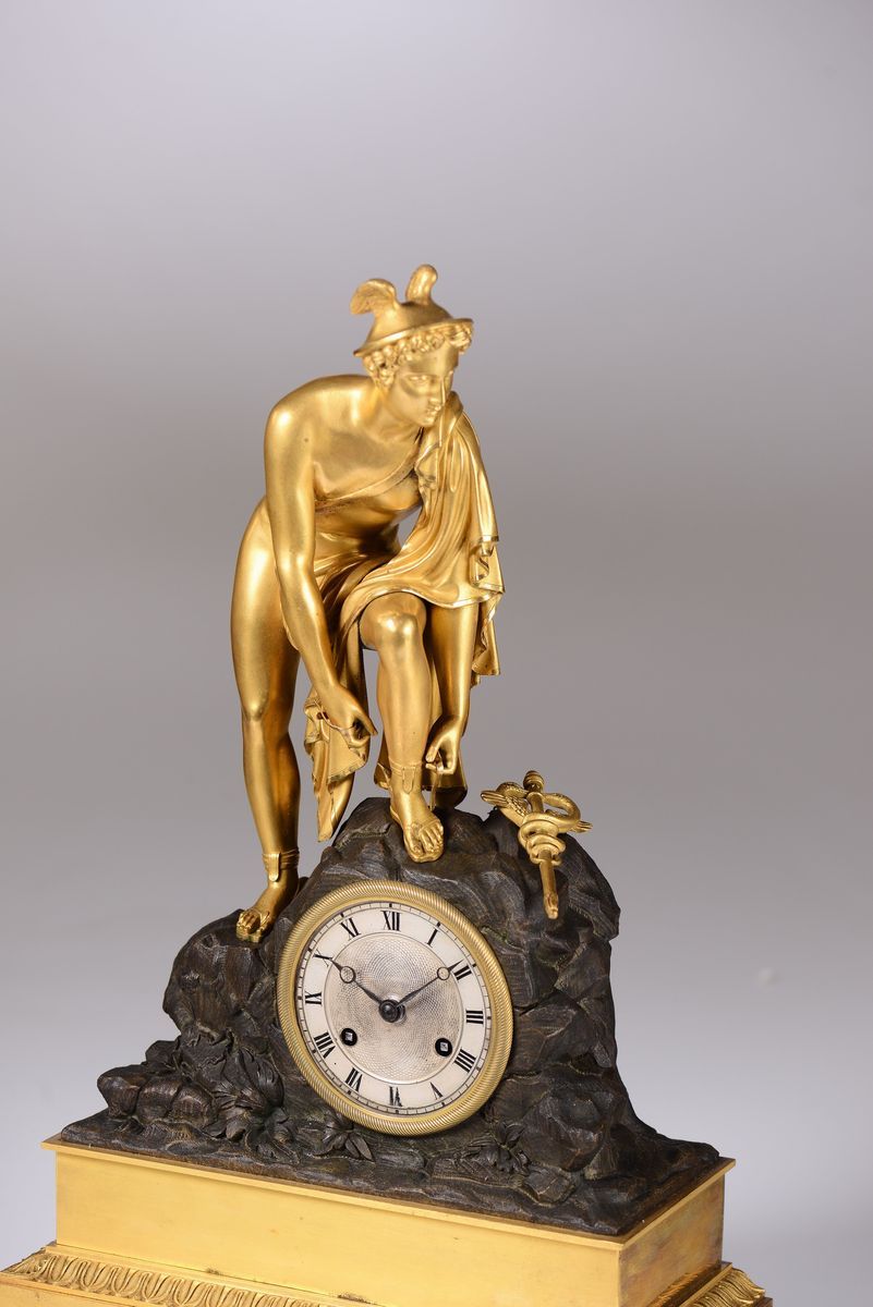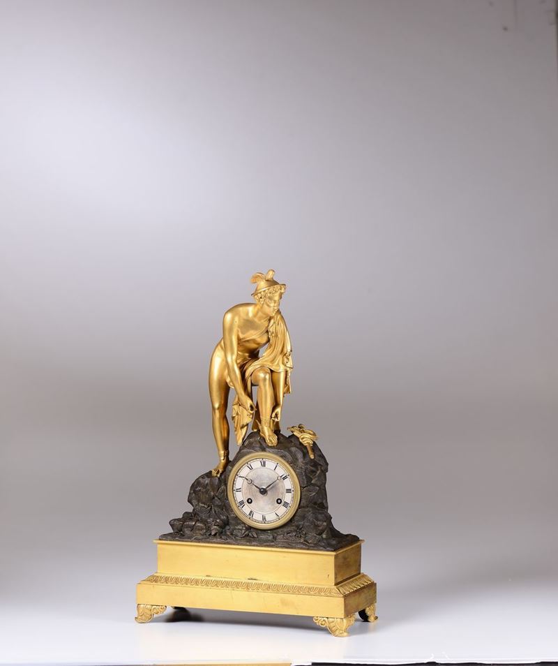 Cassa in bronzo dorato e patinato a forma di roccia sulla quale poggia il piede Mercurio, chino ad allacciarsi un calzare; accanto al piede, è posato il caduceo. Quadrante argentato, con ore in numeri romani neri, inserito nella roccia. Movimento rotondo in ottone, scappamento ad ancora, suoneria ore e mezz'ore su campanello. Sul quadrante, firma parzialmente cancellata ...ons. Scappamento ad ancora, suoneria a ore e mezze su campanello.cm 31x13,5,49