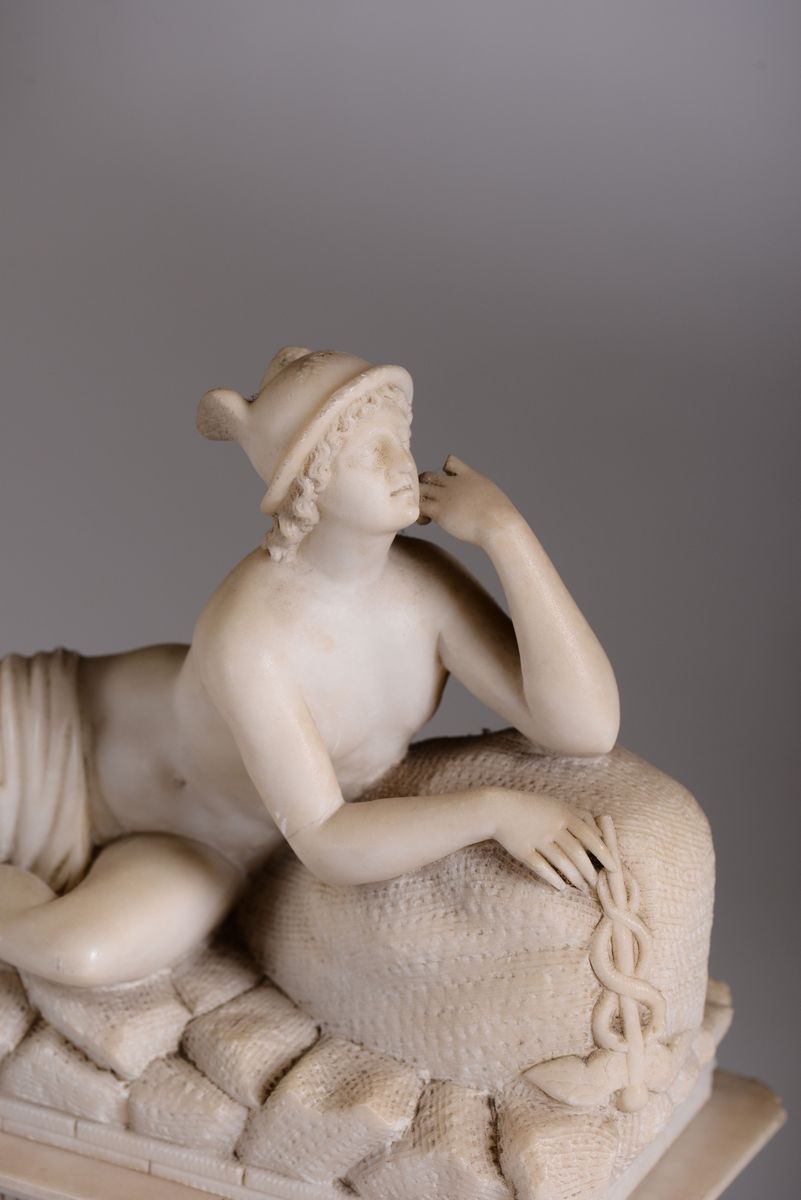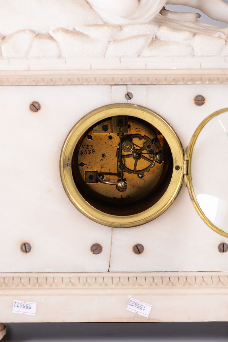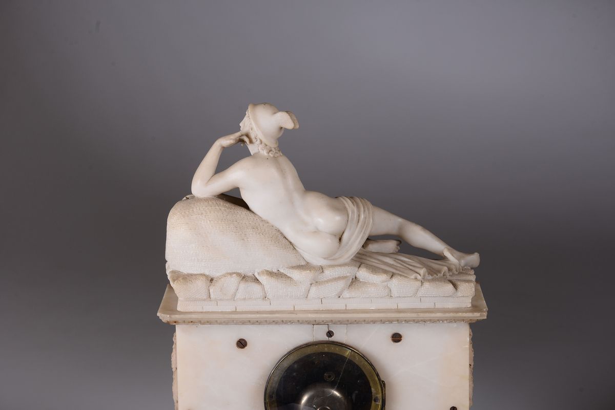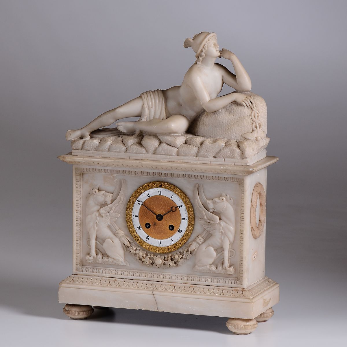 Cassa in alabastro sormontata da figura sdraiata di Ermes. Fascia oraria circolare in smalto bianco con numerazione romana per le ore affiancata da leoni alati scolpiti a bassorilievo. Scappamento ad ancora con sospensione a lamella, suoneria con ruota partitora ad ore e mezze al passaggio.cm 32x14x36