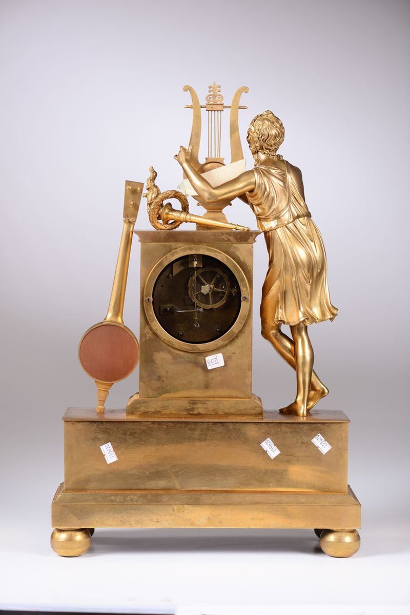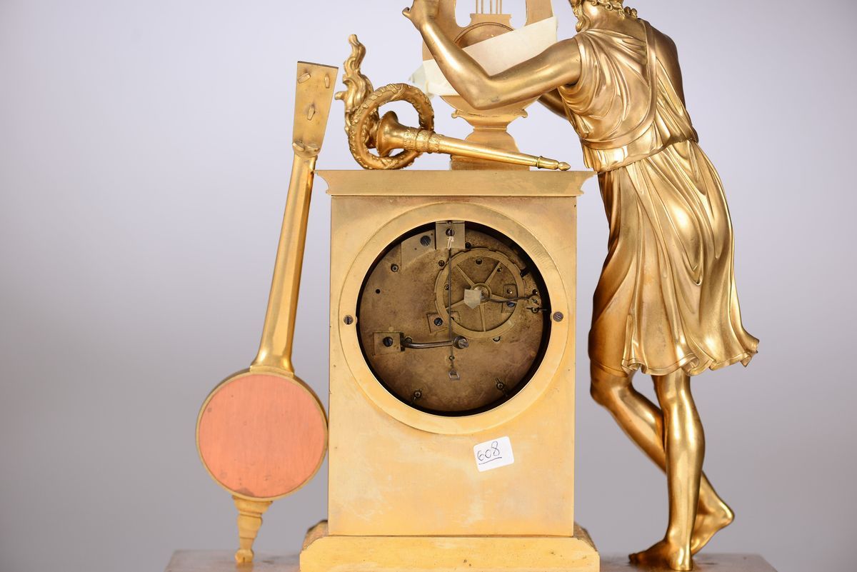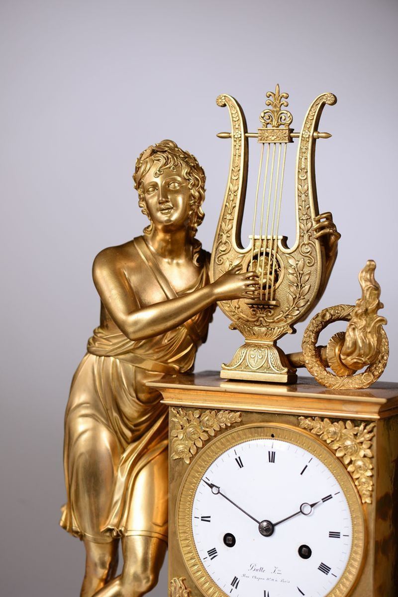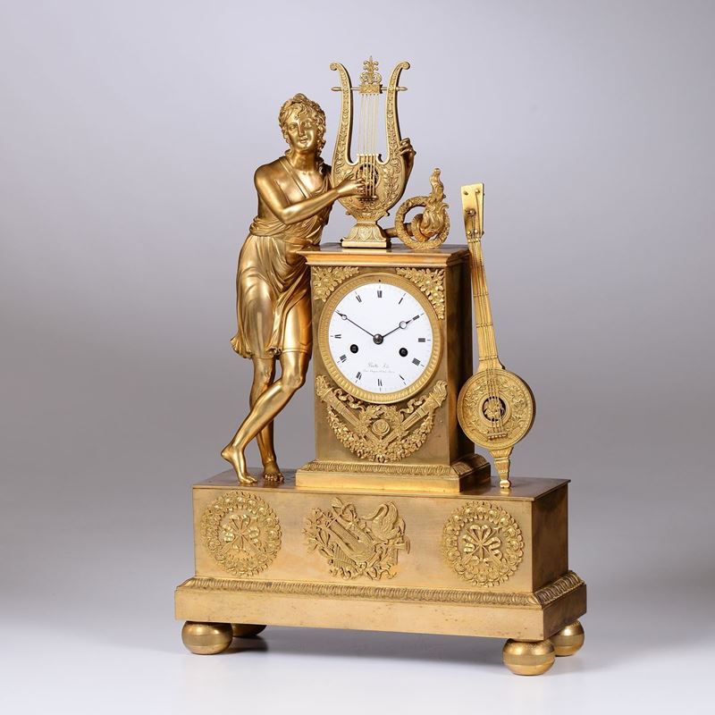 con figura di Apollo a tuttotondo che suona una lira che poggia sopra il quadrante in smalto bianco con numerazione romana in nero per le ore. Scappamento ad ancora, suoneria a ore e mezze su campanello.cm 34x12x53