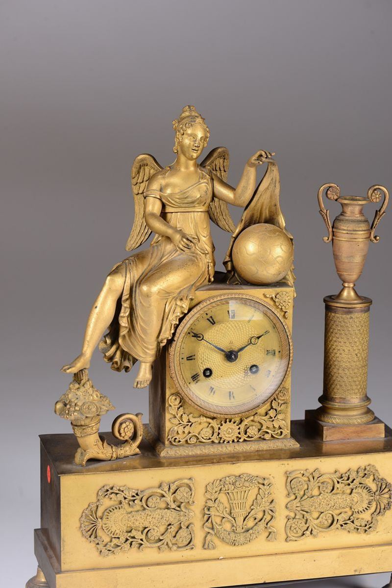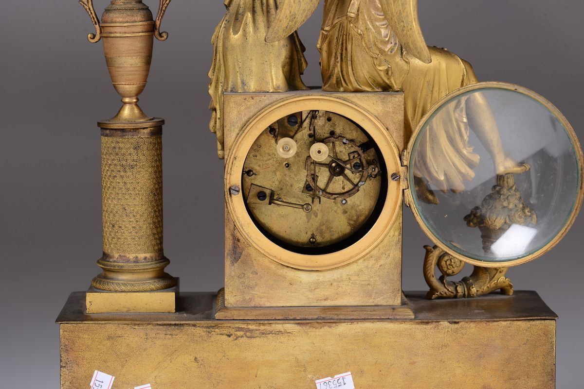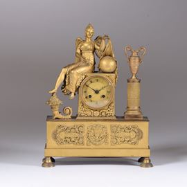 Cassa decorata da figura femminile alata che siede sul quadrante e da vaso biansato su colonna. Fascia oraria circolare dorata con numerazione romana in nero per le ore. Scappamento ad ancora, suoneria a ore e mezze al passaggiocm 31x12x40