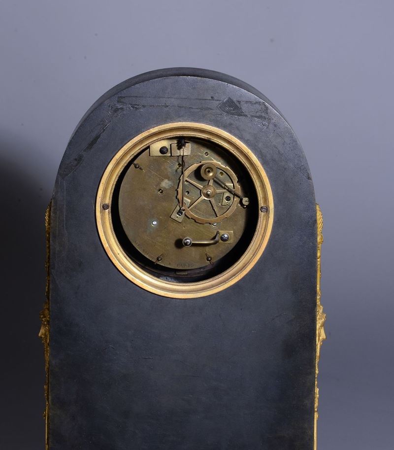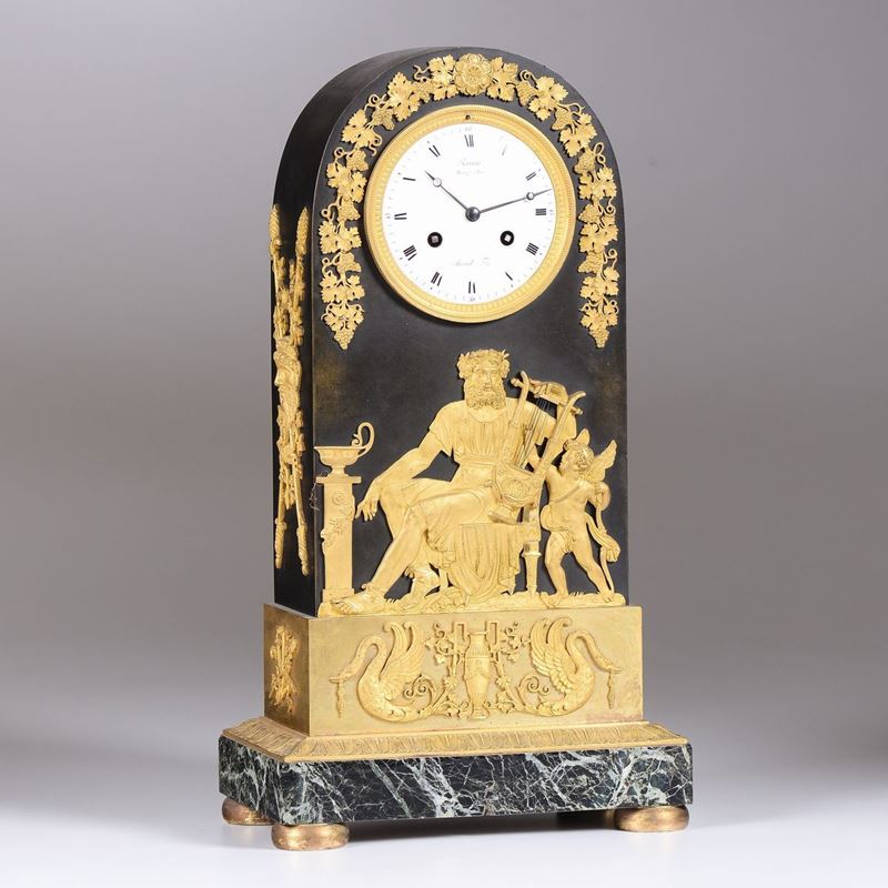 Cassa in bronzo dorato e patinato su base in marmo. Fronte decorato con fregio raffigurante Anacreonte con una cetra e Cupido che suona lo strumento, ai lati mascheroni. Quadrante in smalto bianco con numerazione romana in nero sormontato da tralci di vite applicati. Movimento rotondo in ottone, scappamento ad ancora, suoneria ore e mezz’ore su campanello. Firmato sul quadrante Mesnil hrg e Ravrio Bronz a Paris. Antoine André Ravrio (Parigi 1759-1814) fu uno dei bronzisti più rinomati dell’epoca e fornitore dell’Imperatorecm 26x16x48