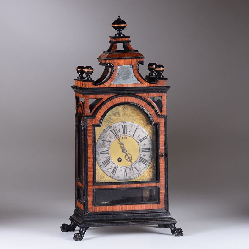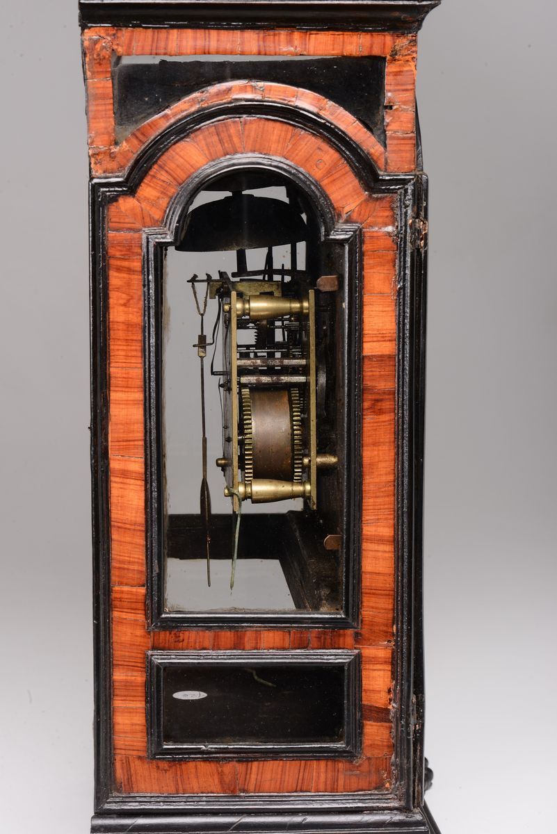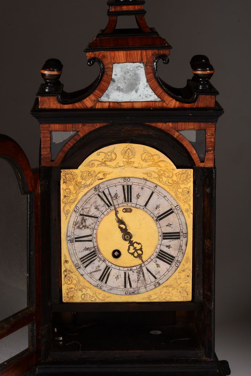 Cassa lastronata in bois de rose con pro li in le-gno ebanizzato sorretta da piedi ferini. Quadrante in metallo dorato con fascia oraria circolare argentata e incisa a motivo vegetale; numerazione romana in nero per le ore e araba per i minuti. Scappamento a verga con suoneria, barile unico. cm 34x19x68