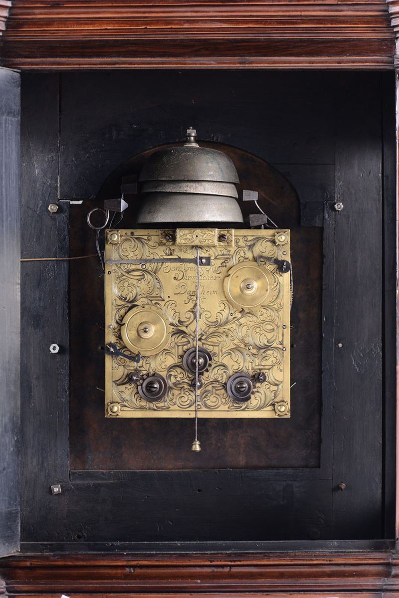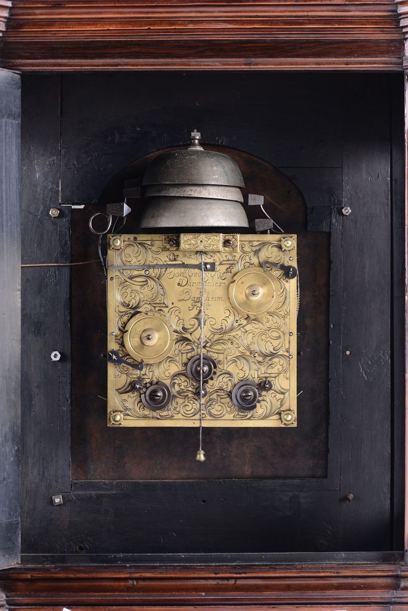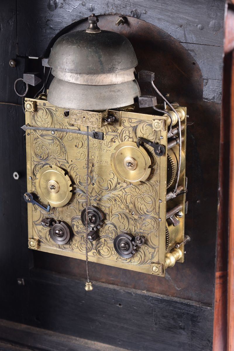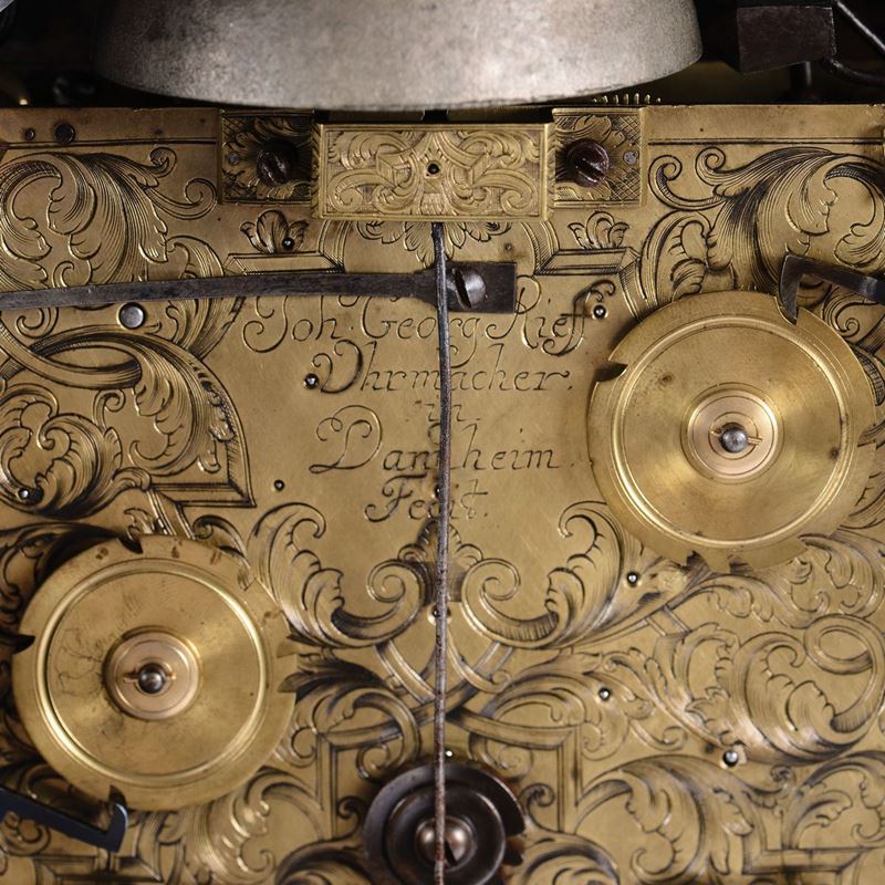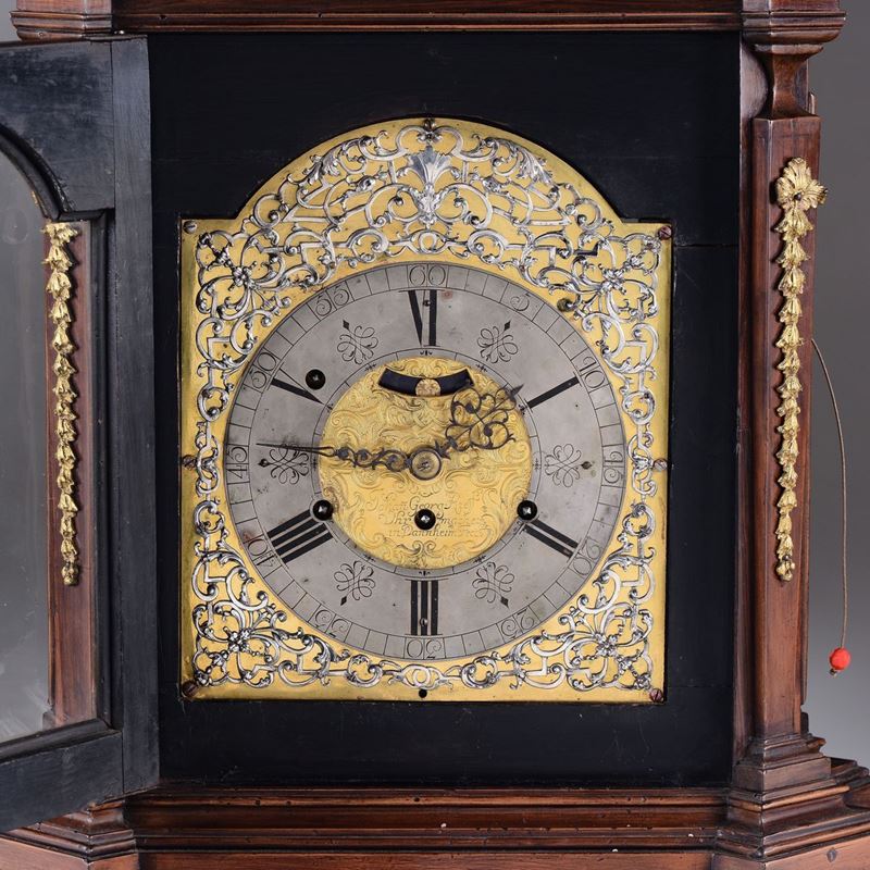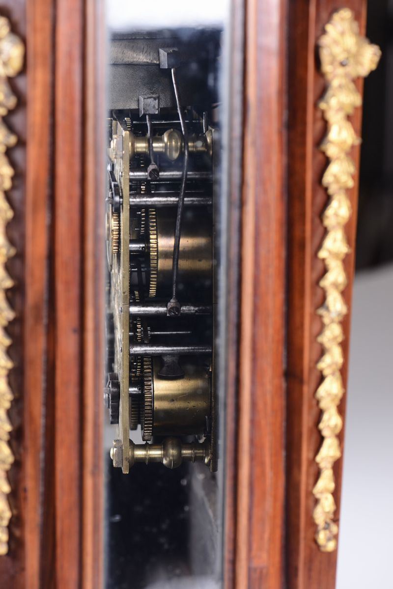 Cassa in legno con guarnizioni e piedini in bronzo dorato. Quadrante in metallo argentato con interno dorato, numerazione in numeri romani ed arabi. Firmato John Georg Rieff. Meccanica con plancia incisa, scappamento a verga, suoneria a sei ore e quarti su campane.cm 51x26x66