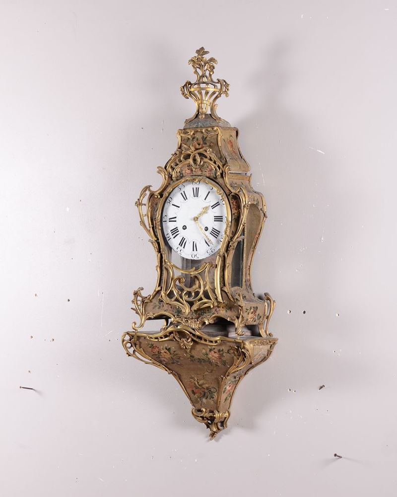 Cassa sagomata dipinta in policromia a motivo floreale su fondo verde, decori applicati in ottone dorato. Quadrante in smalto bianco con numerazione romana in nero per le ore e araba per i minuti. Scappamento ad ancora (modificato), suoneria a ore mezze al passaggio su campana.cm 50x126