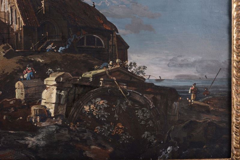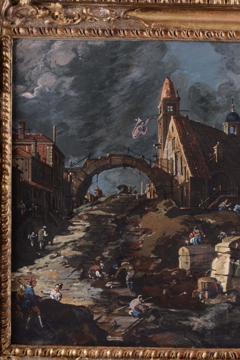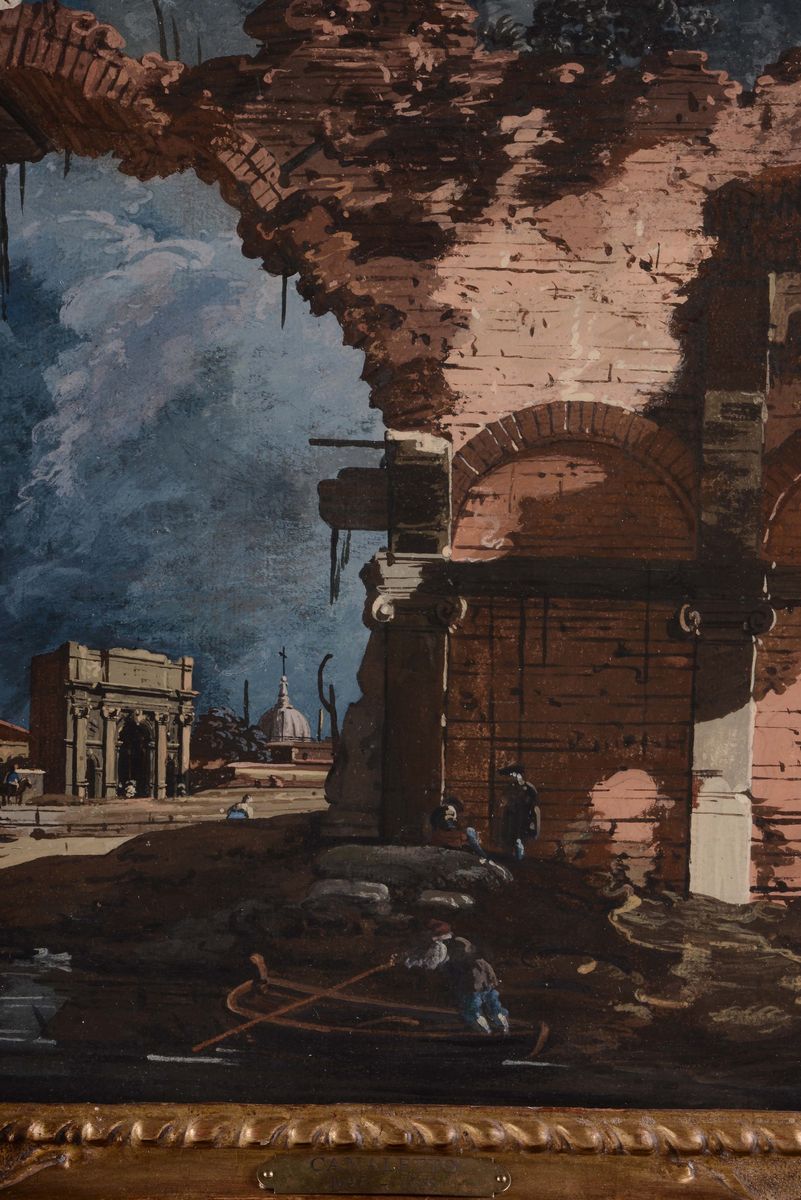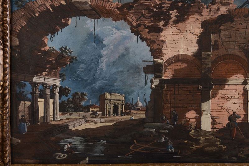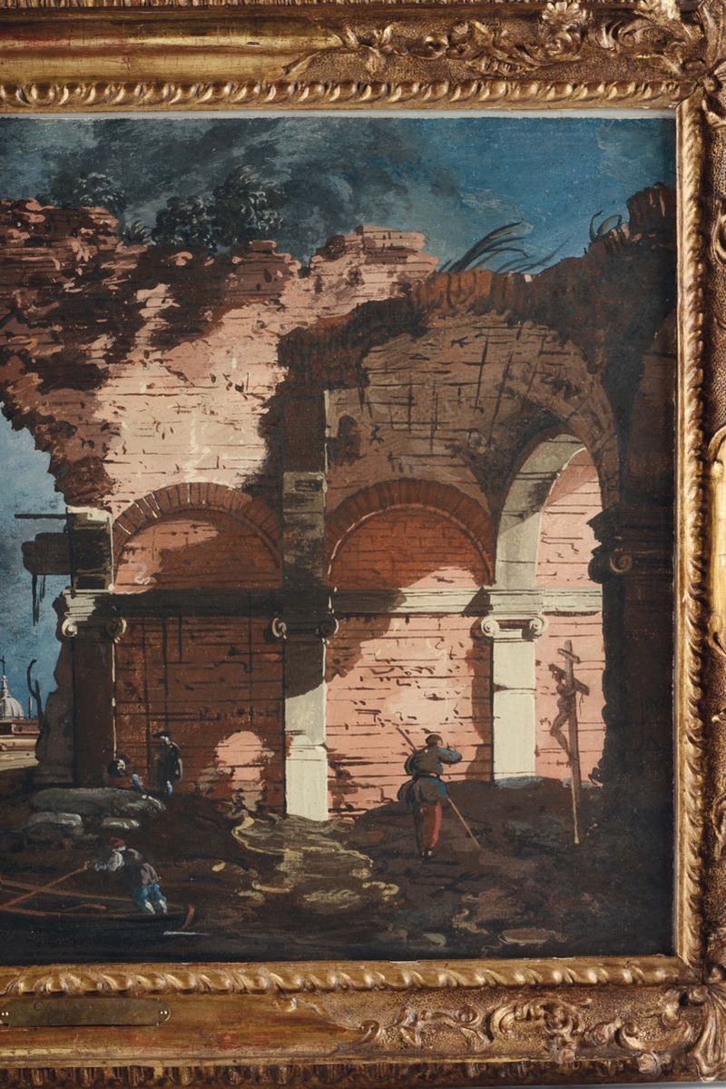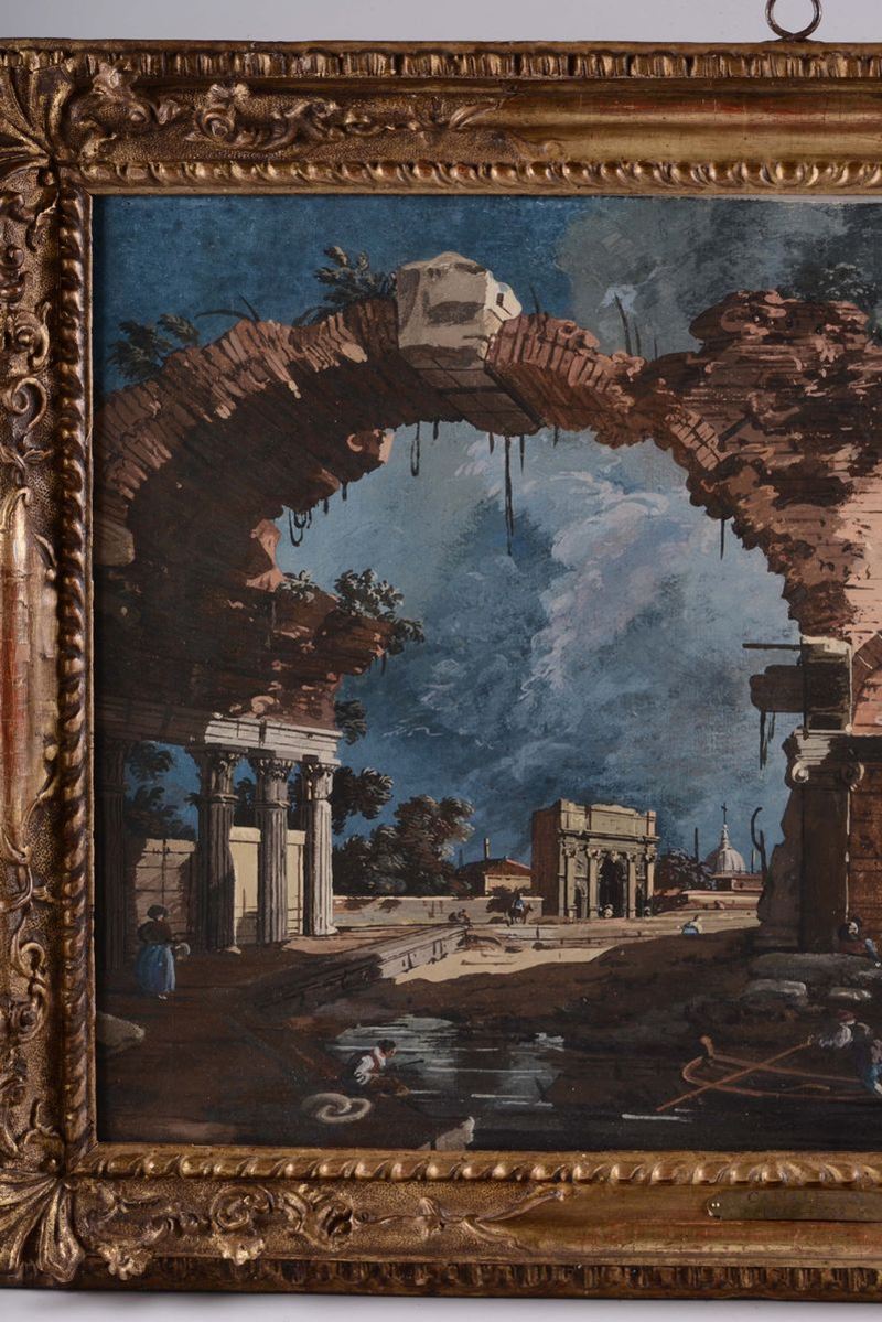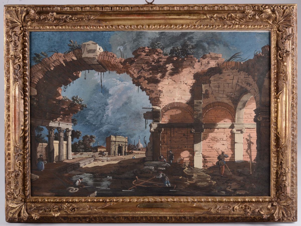 I due dipinti illustrati fanno parte di una ristrettissima cerchia di lavori di Canaletto nei quali, intorno al 1740, il maestro si dedicò alla tecnica della tempera su carta, intorno al 1740 circa. Si tratta di una serie di sole sei opere conosciute di dimensioni molto simile raffiguranti paesaggi di terraferma con rovine classiche e architetture con figure. Il primo dei due rappresenta una cappella su di una collina in prossimità della costa, fiancheggiata da una strada che scende verso il primo piano dove sono presenti rovine. Sul fondo un ponte ad arco che collega gli edifici del lato sinistro della composizione mentre figurette schizzate velocemente animano la scena. Questa composizione può essere messa in relazione a disegni noti del pittore, uno schizzo conservato nello Schlossmuseum di Weimar (JG Links, un integratore a Canaletto di WG Constable, London, 1998 , pag. 53, n. 805 *, pl. 240), un altro, molto più rifinito, nel Victoria and Albert Museum di Londra (Constable I, pl.152, II, n. 805). La seconda composizione, dai toni più luminosi mostra invece rovine architettoniche con un grande arco sulla sinistra che sfonda prospetticamente verso un paesaggio con architetture che compare sullo sfondo. Anche in questo caso alcune figure animano la scena in primo piano. Questa composizione è a tutt’oggi inedita anche se ricorda i primi disegni romani, in particolare le rovine di un edificio a cupola e un arco riprodotti in un disegno conservato a Windsor (Constable I, pl.153, II, n 815;. Kozakiewicz I, p illustrata 0,226), mentre la parte inferiore del lato destro è ripresa in controparte in un disegno di Bellotto (Hessischen Landesmuseum, Darmstadt) derivato probabilmente da Canaletto e da un’incisione (Kozakiewicz nn. 114-115, entrambi illustrati) Esposizioni: Barcellona, Centro di Cultura Contemporanea, Canaletto: Una Vanècia Imaginaria, 20 Febbraio - 13 maggio 2001 Madrid, Museo Thyssen-Bornemisza, Canaletto: Una Venecia Imaginaria, 29 maggio - 2 SETTEMBRE 2001 Passariano (Udine), Villa Manin, Da Canaletto a Zuccarelli: il paesaggio veneto del Settecento, 8 agosto - 16 novembre 2003 Bibliografia Canaletto: Una Vanècia Imaginaria, 2001 Catalogo della mostra di Barcellona, pp.172-7, n. 67-70 Canaletto: Una Venecia Imaginaria, 2001 Catalogo della mostra di Madrid, Museo Thyssen-Bornemisza, pp. 222-7, n .77-80 Da Canaletto a Zuccarelli: il paesaggio veneto del Settecento, 2003 Catalogo della mostra di Pasarino, pp.384-9, n.105-8 Scheda del Prof. Charles Beddington At several stages in his career, Canaletto displayed an interest in technical experimentation which enhances even further his stature as an artist over that of any of this contemporaries. In the late 1720s he briefly used copper as a support, and nine paintings on copperplates are known. Similarly, when occupying a studio over a cabinet-maker's during his years in London, on four occasions he painted views on ungrounded mahogany panels. Also during his English period Canaletto replaced his normal use of a russet colored ground with one of light grey. This desire for new challenges is particularly evident in the 1740s, when, as well as expanding his repertoire to mainland subjects, for a period he showed a notable interest in - and aptitude for - etching. Thus it should come as no surprise to find him trying his hand at tempera, a medium in which such notable results had been achieved by Marco Rici, an artist who had such a strong formative influence on his style. The re-emergence of these two gouaches, which I have studied in the original, brings to six the number of known works in this medium by Canaletto. They are entirely consistent in handling with the only four works by Canaletto in this medium known hitherto, a group in a private collection, said to be in Milan. All are datable to the 1740s. They are of very similar dimensions (36.5 x 53.5 cm.), and were similarly unknown until their inclusion in the following exhibitions (on each occasion the entry or entries was by Annalia Delneri): Barcellona, Centre de Cultura Contemporània, Canaletto: Una Vanècia Imaginària, 20 February - 13 May 2001, pp.172-7, nos.67-70, all illustrated in colour. Madrid, Museo Thyssen-Bornemisza, Canaletto: Una Venecia Imaginaria, 29 May - 2 September 2001, pp.222-7, nos.77-80, all illustrated in colour. Passariano (Udine), Villa Manin, Da Canaletto a Zuccarelli: il paesaggio veneto del Settecento, 8 August - 16 November 2003, pp.384-9, nos.105-8, al illustrated in colour (the illustrations for nos.106-7 switched). Variants of the compositions of three of those were already knoen:of the Tomb by the Lagoon, a closely corresponding painting in the Berlin Gemäldegalerie (W. G. Constable, Canaletto, London, 1962, II, no. 486(b); S. Kozakiewicz, Bernardo Bellotto, Recklinghausen/London, 1972, II, pp.484-5, no. Z391, illustrated) and a varinat in the Uffizzi (Constable no. 486; Kozakiewicz no. Z 390, illustrated); of the Cylindrical Tower near a Bridge by the Lagoon a variant drawing (Constable I, pl.152; II, no. 806); and of the Castle on a Bridge by the Lagoon a closely related painting (Constable I, pl.89, II, no.481). PRints by Fabio Berardi (1728-1788) show the first two compositions, in reverse, the second with variantions. The fourth composition was, however, previously completely unknown. It shows A Ruined Demi-Dome with a Lantern by the Lagoon and suggests, as Delneri has pointed out, That Canaletto here again,as often in the early 1740s, revisited the drawings which he had made in Rome in his youth in 1719-1720, all but one of which were retained in the studio throughout his career. Of the present two gouaches, one, the Chapel on the Side of a Hill, has similarly already been known in variant drawings, one, a compositional sketch in the Schlossmuseum, Weimar (J.G. Links, A Supplement to W.G. Constable's Canaletto, London, 1998, p. 53, no. 805*, pl. 240), the other, far more finished, in the Victoria and Albert Museum, London 