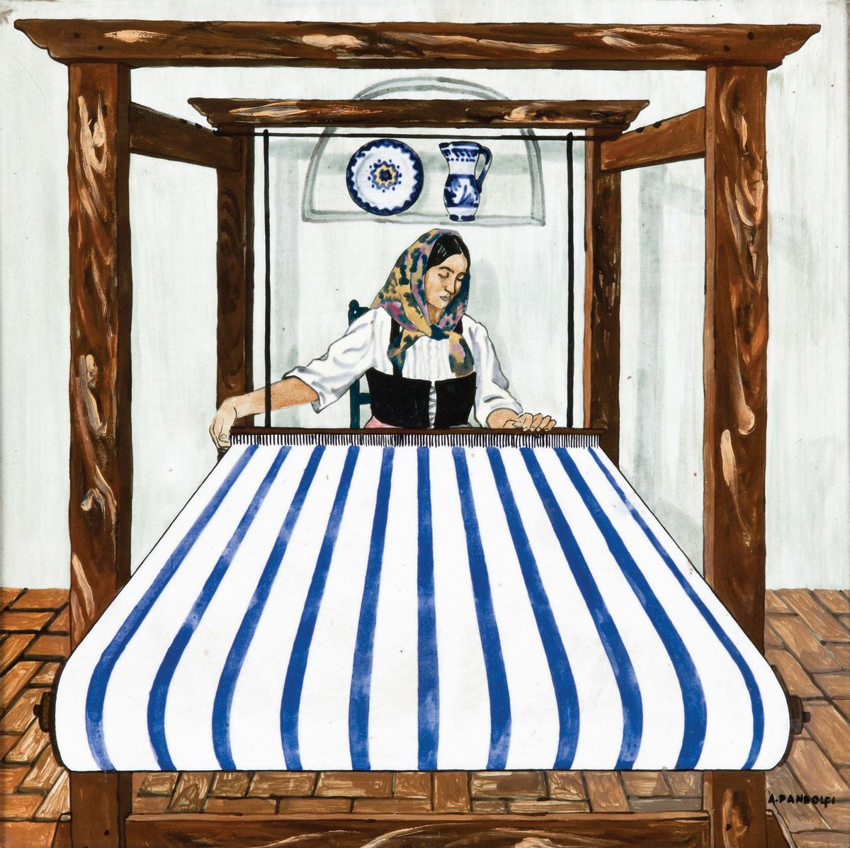 Grande mattonella in terracotta maiolicata raffigurante donna al telaio incorniciata.cm 39x39,5Firmata A.Pandolfi