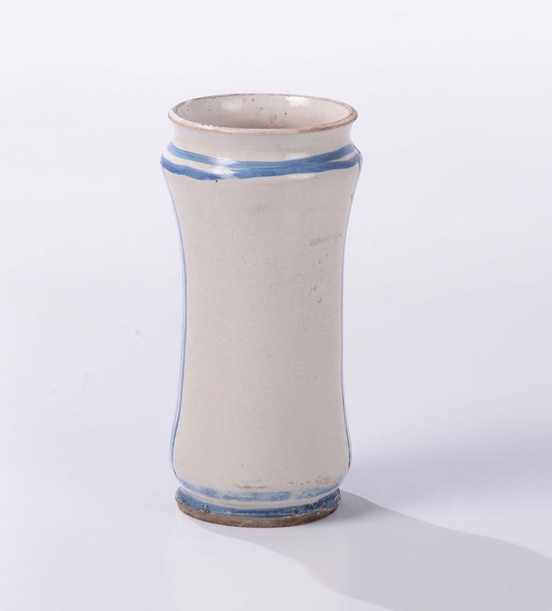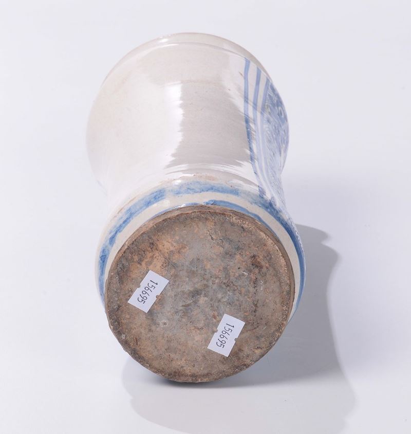 Grande ciotola in terracotta maiolicata a lustri su alto piede con decoro di rose e pesci.Altezza cm 24, diametro cm 33Marchio sotto il piede