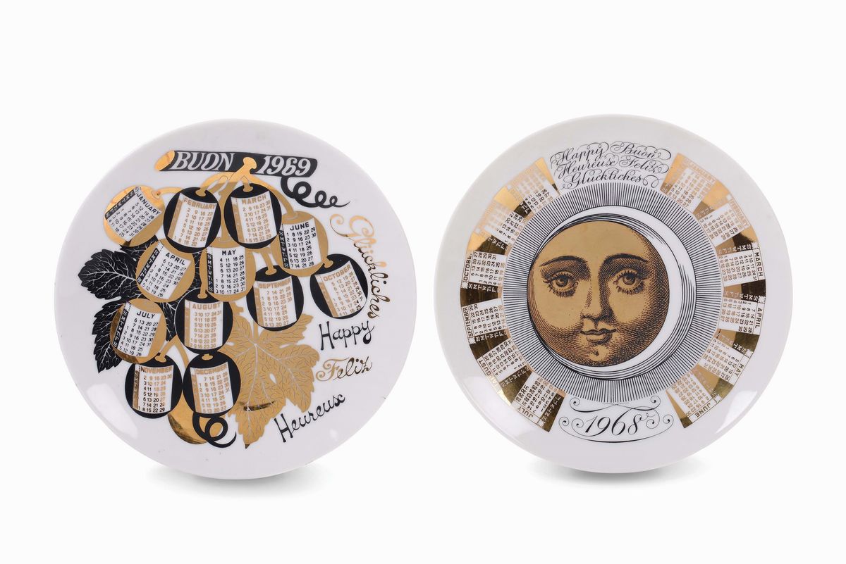 Coppia di piatti serie Datario, 1968 e 1969 in porcellana con dorature.Diametro cm 24