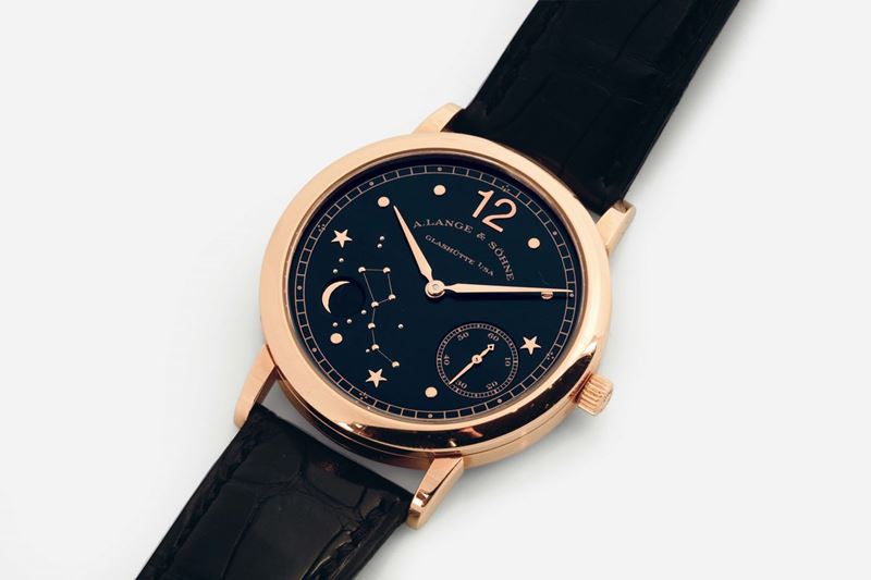 Cassa:Tre-corpi, solida, lucidata, fondello trasparente con 6 viti, anse curve. Vetro zaffiroQUADRANTE: Nero con applicati indici tondi in oro rosa e indici Star e numero Arabo 12, pista esterna minuti, contatore ausiliare secondi a ore 4, apertura per le fasi lunari decorati con una costellazione di stelle sui lati. Sfere in oro Alfa.MOVIMENTO: Cal. L 943,1, 26 rubini, rodiato, scappamento ad ancora, spirale piana, regolatore a collo di cigno, ponte del bilanciere inciso a mano. Quadrante, cassa e movimento firmato, in ottime condizioniDIAMETRO: 36 mm SPESSORE: 8 mm.NOTA: A. Lange & Söhne è un marchio di una casa di produzione di orologi d'alta gamma tedesco, fondato nel 1845 a Glashütte, in Germania, e rilanciato nel 1990 dopo quarantacinque anni di chiusura tra la fine della seconda guerra mondiale e il crollo del muro di Berlino. Produce orologi da polso di lusso, con movimenti prodotti dalla manifattura stessa in poche migliaia di esemplari all'anno.