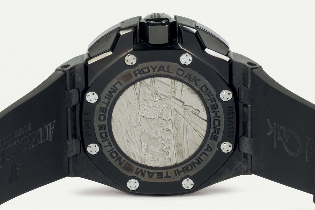 AUDEMARS PIGUET, Royal Oak Offshore, Team Alinghi, No. G 045.49, 1153/1300. Realizzato in edizione limitata di 1300 esemplari nel 2008. Cronografo da polso in carbonio,ceramica, titanio e gomma con 10 minuti di conto alla rovescia digitale centrale, 20 minuti e registri cronografo 6 ore, il cinturino in caucciù con fibbia Audemars Piguet in titanio annerito. Accompagnato dalla scatola originale