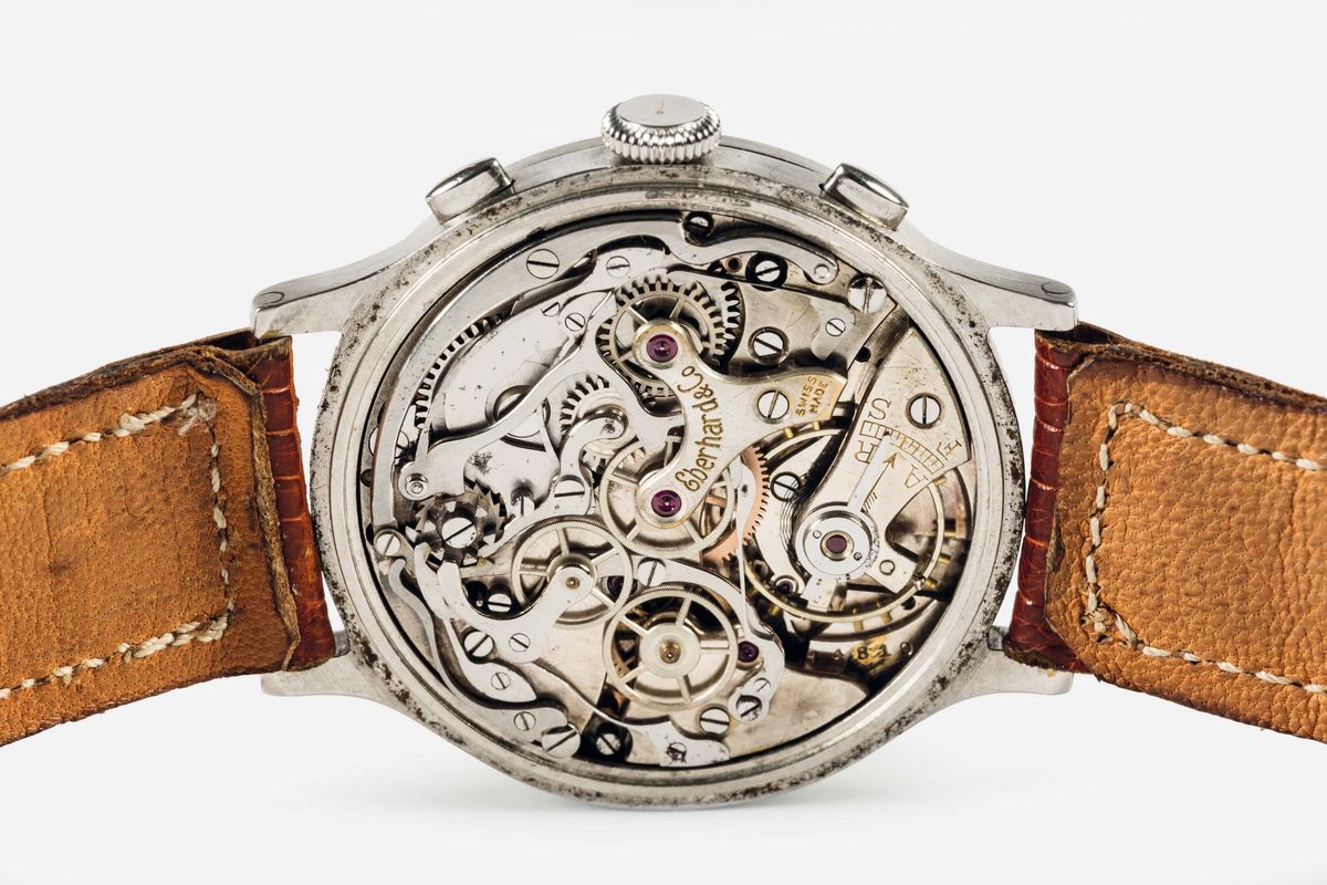 CASSA: Tre corpi, lucidata e satinata, fondello a scattoQUADRANTE: In smalto nero, con numeri Breguet, contatori per i secondi, ore e minuti, scala tachimetrica e telemetrica. Sfere a bastoneMOVIMENTO: Rodiato, scappamento ad ancora, spirale pianaQuadrante, cassa e movimento firmati, in buone condizioniDIAMETRO: 40 mm SPESSORE: 13 mmNOTA: La Chaux-de-Fonds, 1887. Georges Eberhard fonda, a soli 22 anni, la Manufacture d’Horlogerie Eberhard & Co. L’azienda si specializza nella produzione di orologi ad alto contenuto tecnico lanciando il cronografo da tasca a cui segue, nel 1919, il primo cronografo da polso. Nel 1935 l’innovazione è portata dal cronografo a due pulsanti con arresto e rimessa in marcia senza azzeramento; il 1938 rappresenta invece l’anno di lancio del primo cronografo con il contatore delle ore. Arriva il 1939 e, con esso, una nuova rivoluzione: la Maison crea un cronografo da polso dotato di un innovativo dispositivo rattrappante che permette il doppio cronometraggio. Sono gli anni in cui i cronografi Eberhard solcano i mari al polso degli ufficiali della Regia Marina Militare Italiana. Ma non solo: nell’immediato dopoguerra, sul finire degli anni ’40, ecco il primo Extra-Fort, un vero gioiello dell’orologeria con pulsante a slitta per la misurazione dei tempi intermedi.