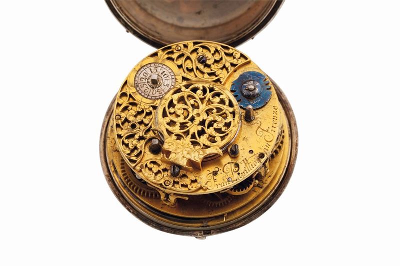 QUADRANTE: In argento con numeri RomaniMOVIMENTO: dorato, scappamento a verga, coq con decorazioni florealiMovimento firmatoDIAMETRO: 48 mmNOTE: L'orologiaio francese Francesco Papillon, autore di questo orologio, risulta immatricolato all'arte degli orologiai a Firenze nel 1705. Contatti e collaborazioni con l'ambiente granducale sono documentati da vari altri esemplari firmati, inseriti in casse d'orologio decorate con raffinati lavori in pietre dure. Si tratta dello stesso Francesco Papillon che ha firmato il prestigioso orologio con pietre dure proveniente dalla Botteghe Granducali Fiorentine pubblicato sul catalogo della mostra Tempo Reale etempo della realtà: Gli orologi di Palazzo Pitti dal XVI all¹ XIX. La manifattura Medicea fiorentina nacque grazie a Ferdinando I de Medici, che fondò nel 1588 una sorta di laboratorio delle arti decorative, dove le botteghe creavano prodotti artigianali destinati allacorte (Giusti 2005, p.47).
