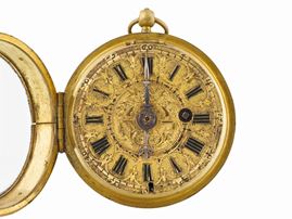 CASSA: Due corpi, lavorata con motivi florealiQUADRANTE: Dorato con numeri Romani, pista dei minuti esternaMOVIMENTO: Dorato, coq lavorato con motivi floreali, scappamento a vergaQuadrante, cassa e movimento in buone condizioni, movimento firmatoDIAMETRO: 59 mm