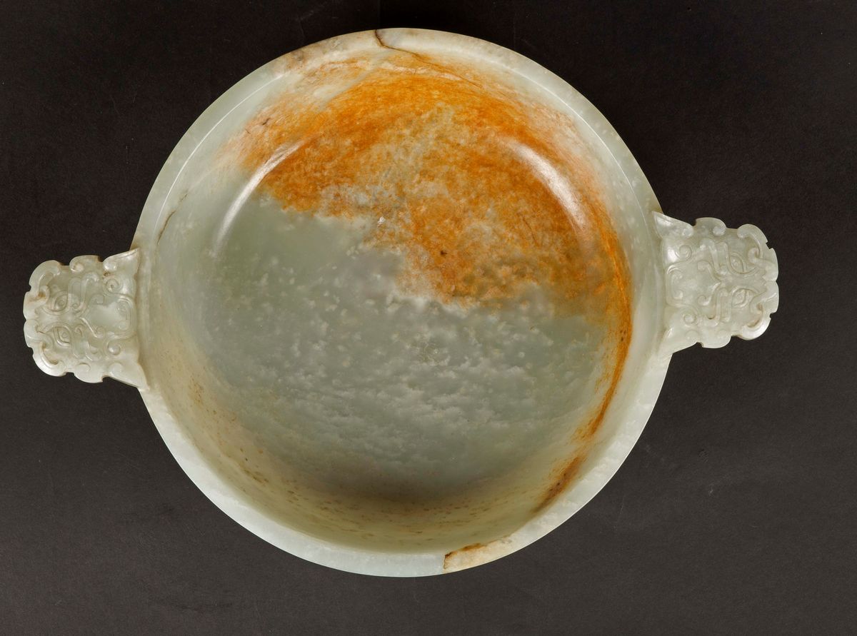 Ciotola in giada bianca Celadon e russet con manici ad anelli e decoro d'ispirazione arcaica, Cina, Dinastia Qing, XVIII secolo