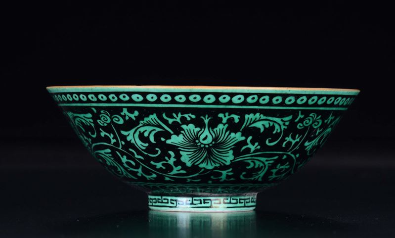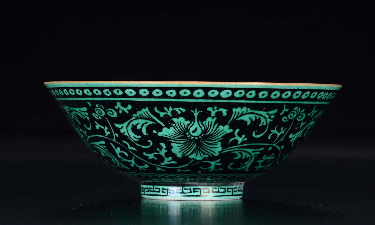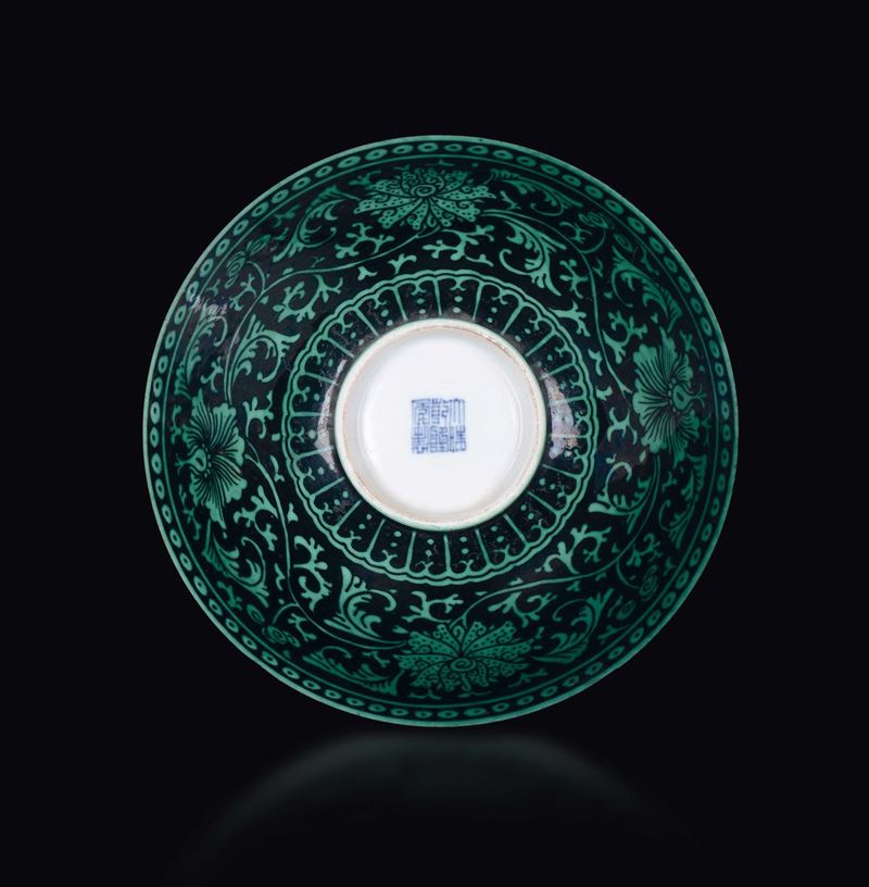 Ciotola in porcellana a fondo nero con decoro verde di fiori di loto, Cina, Dinastia Qing, marchio e del periodo Qianlong (1736-1795)