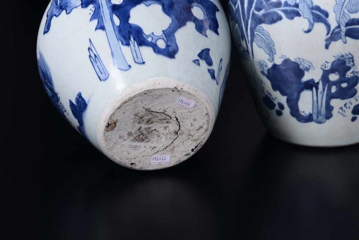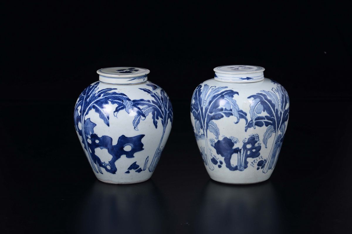 Coppia di poriches con coperchio in porcellana bianca e blu con animali fantastici, Cina, Dinastia Qing, XVIII secolo