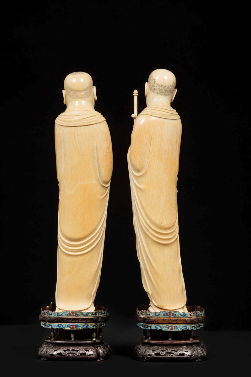 Coppia di suonatori scolpiti in avorio con piatti e tamburello con stand in legno e cloisonné, Cina, Dinastia Qing, XIX [..]