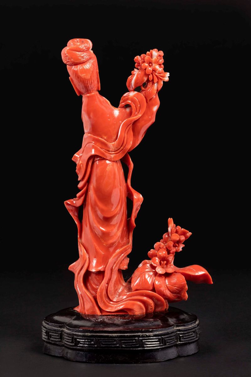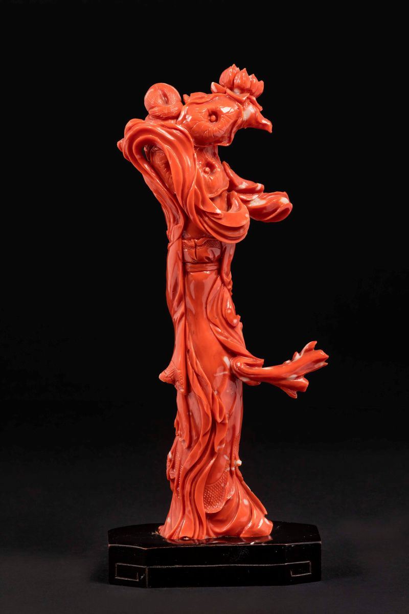 Due figure di Guanyin scolpite in corallo con fiori, Cina, inizio XX secolo