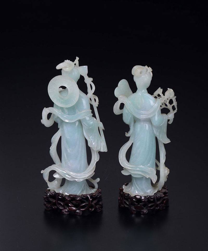 Due figure di Guanyin scolpite in giadeite una con ventaglio ed una con stendardo, Cina, inizio XX secolo