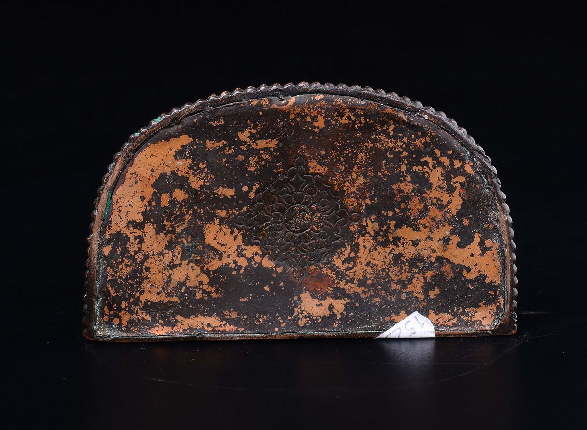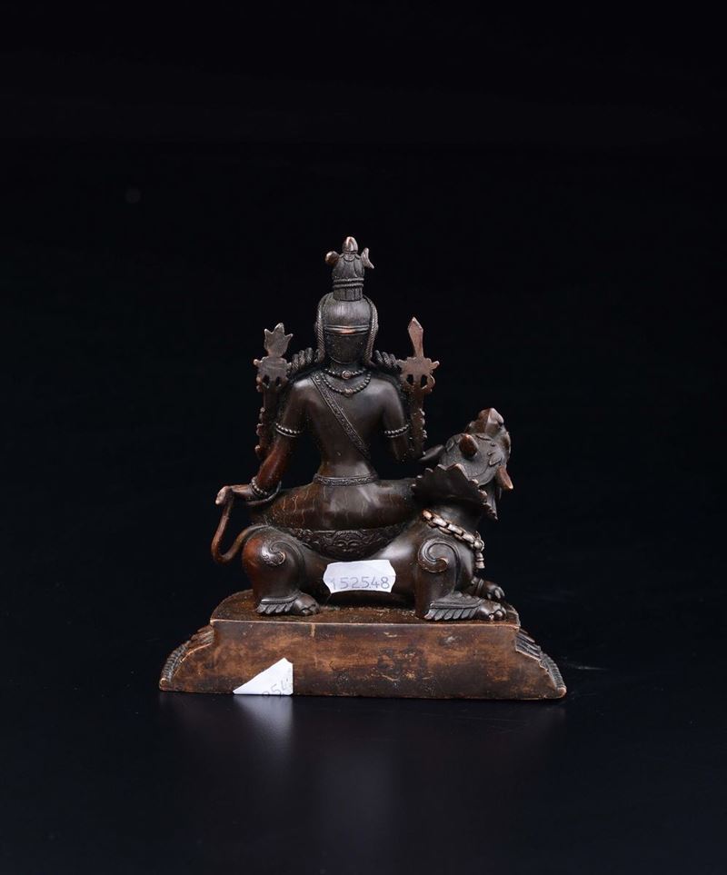 Figura di Amitayus in rame Shi shou con intarsi in argento seduta su cane di Pho su base a doppio fiore di loto, Cina, Dinastia [..]