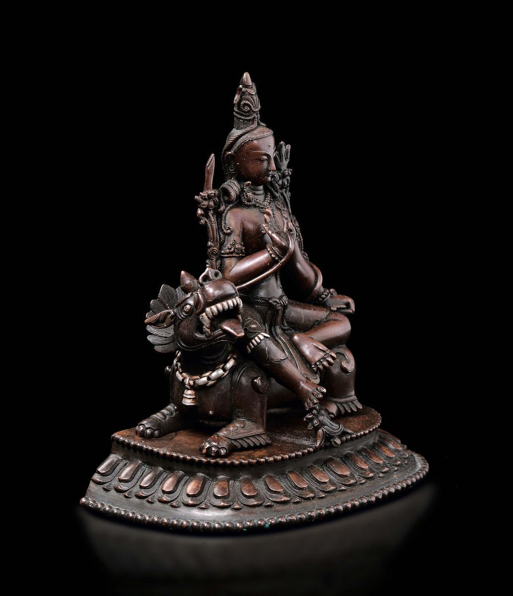 Figura di Amitayus in rame Shi shou con intarsi in argento seduta su cane di Pho su base a doppio fiore di loto, Cina, Dinastia Qing, XVIII secolo