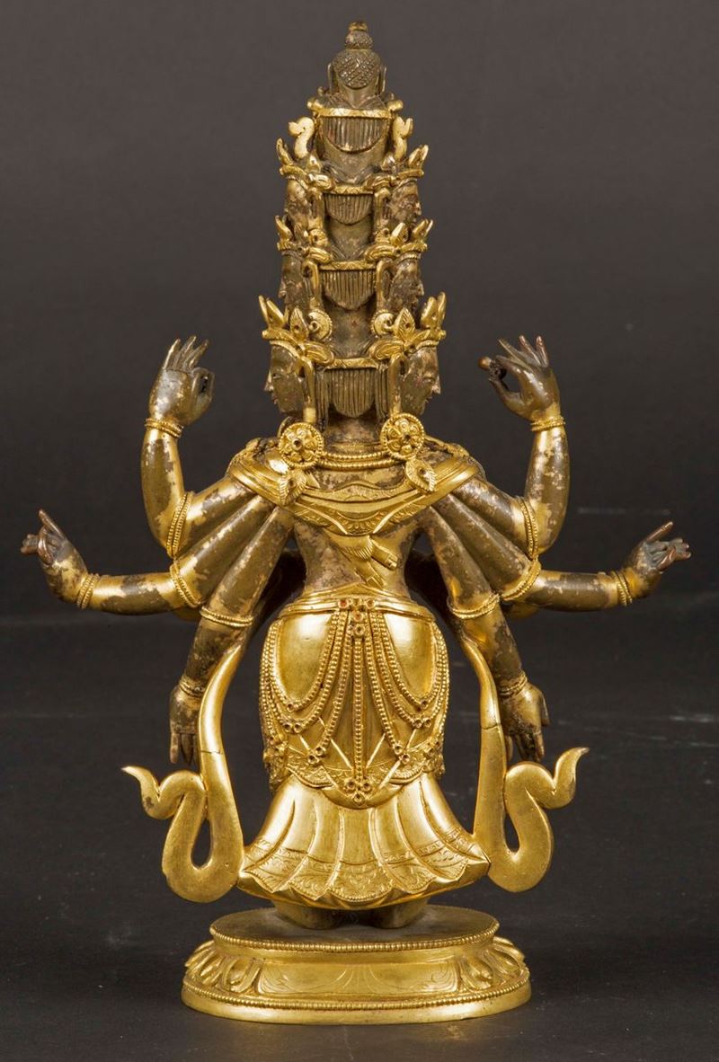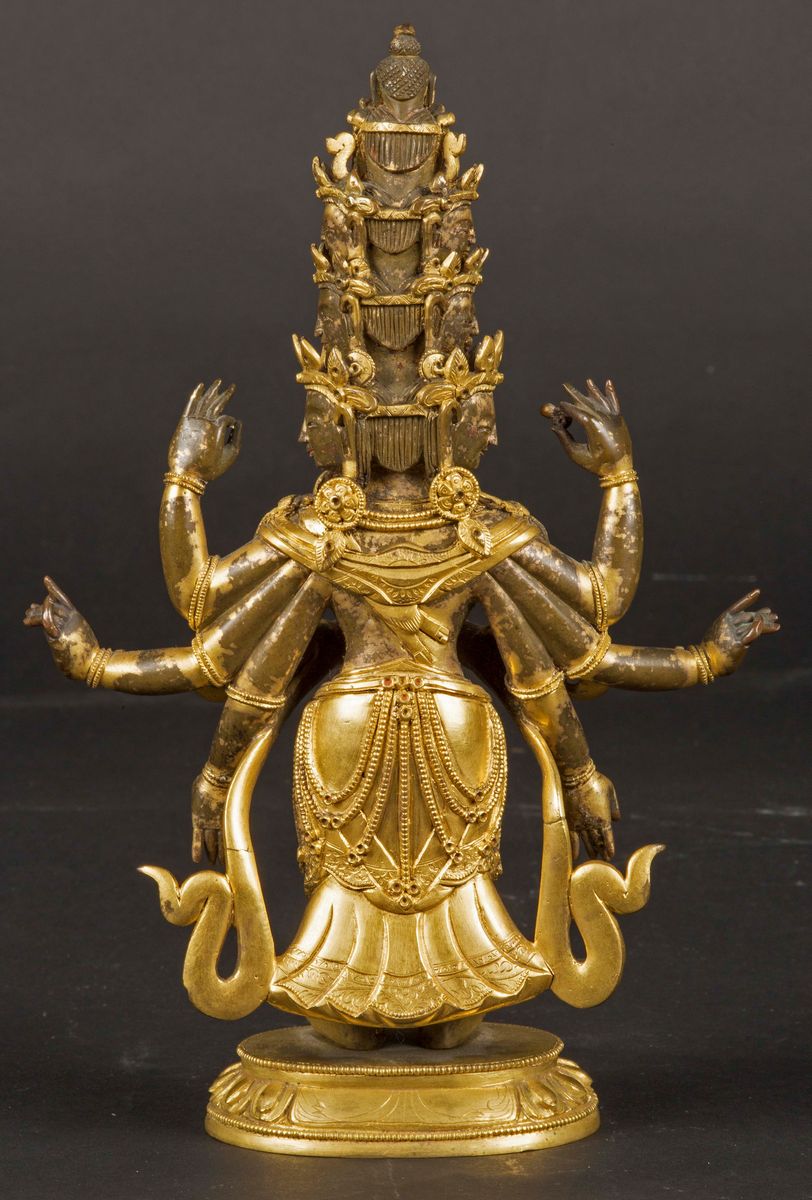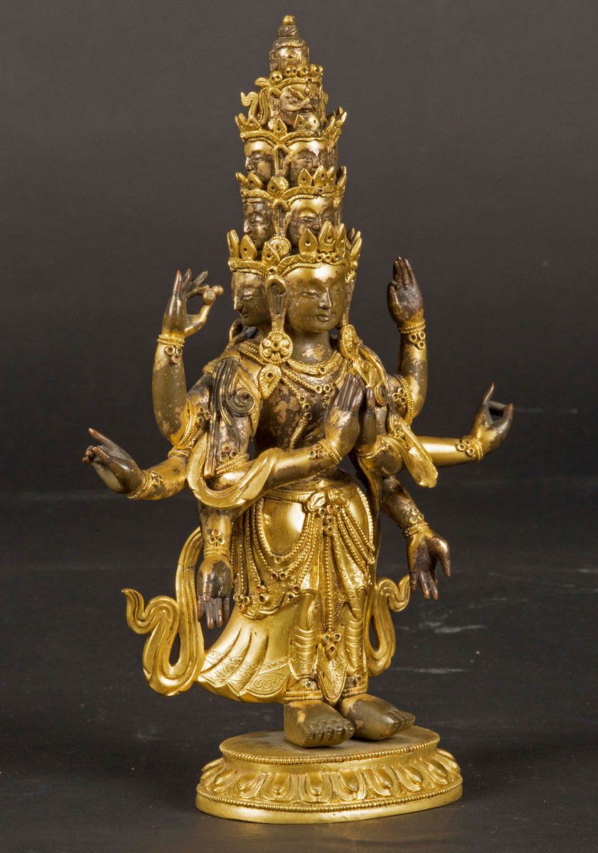 Figura di Avalokitesvara ad undici teste in bronzo dorato eretta su fiore di loto, Cina, Dinastia Qing, XVIII secolo