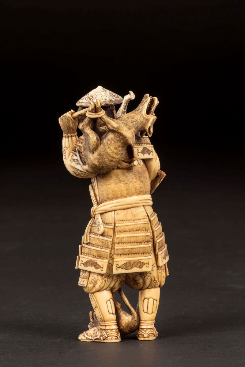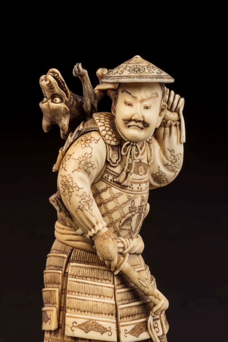Figura di cacciatore con cagnolini scolpita in avorio, Giappone, inizio XX secolo