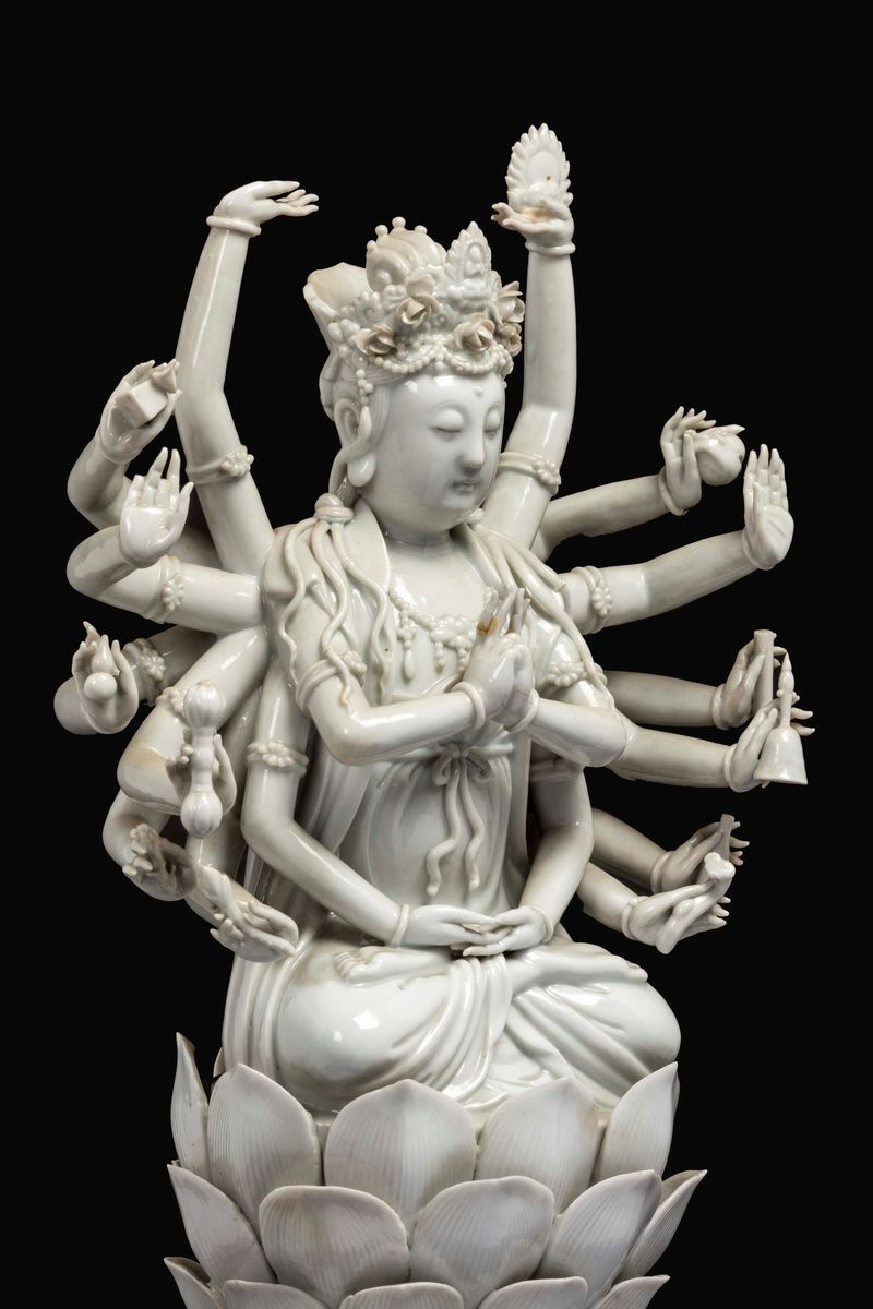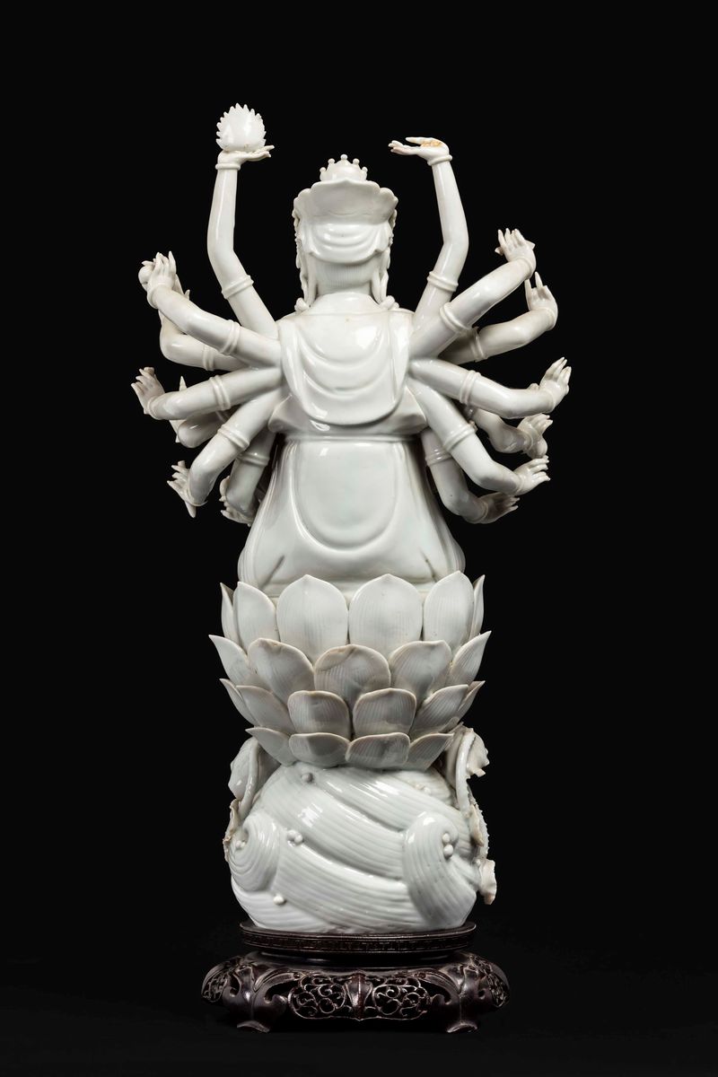 Figura di Doumu in porcellana Blanc de Chine Dehua seduta su fiore di loto, Cina, Dinastia Qing. XIX secolo
