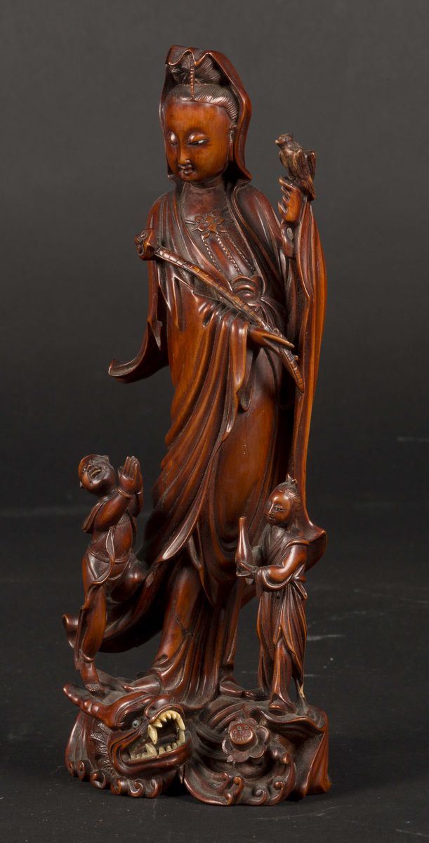 Figura di Guanyin con ruyi circondata da fanciulli sopra drago in legno, Cina, Dinastia Qing, XIX secolo